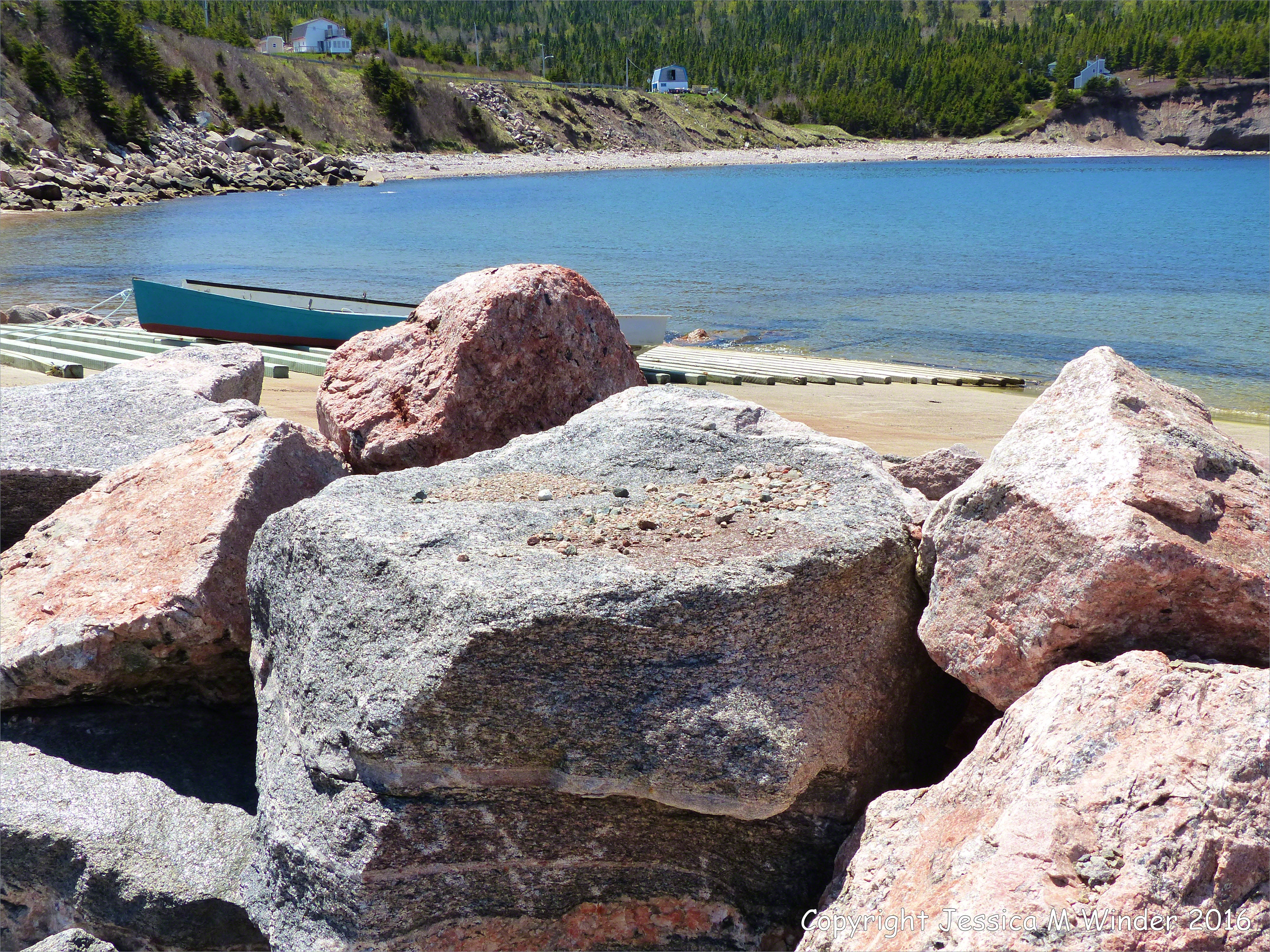 Rock Texture & Pattern at White Point 16 – Texture and pattern in Devonian plutonic rocks used as rip-rap at White Point harbour in Cape Breton Island, Nova Scotia, Canada, on the Cabot Trail. These rip-rap boulders come from the Black Brook Granitic Suite and include granitic gneiss intruded into biotite schist .