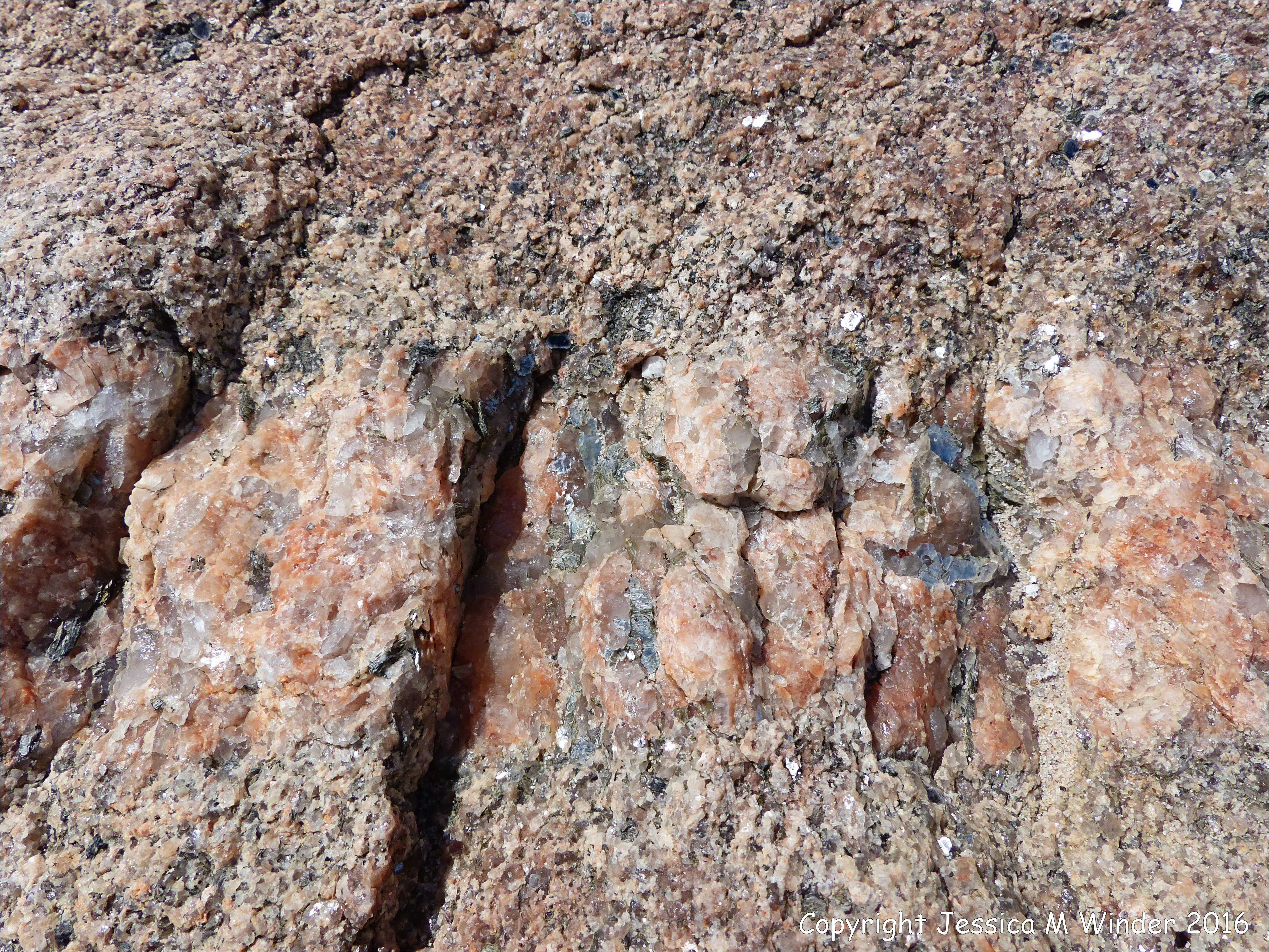 Rock Texture & Pattern at White Point 28 – Macro-photograph of texture and pattern in Devonian plutonic rocks used as rip-rap at White Point harbour in Cape Breton Island, Nova Scotia, Canada, on the Cabot Trail. These rip-rap boulders come from the Black Brook Granitic Suite and include granitic gneiss intruded into biotite schist .