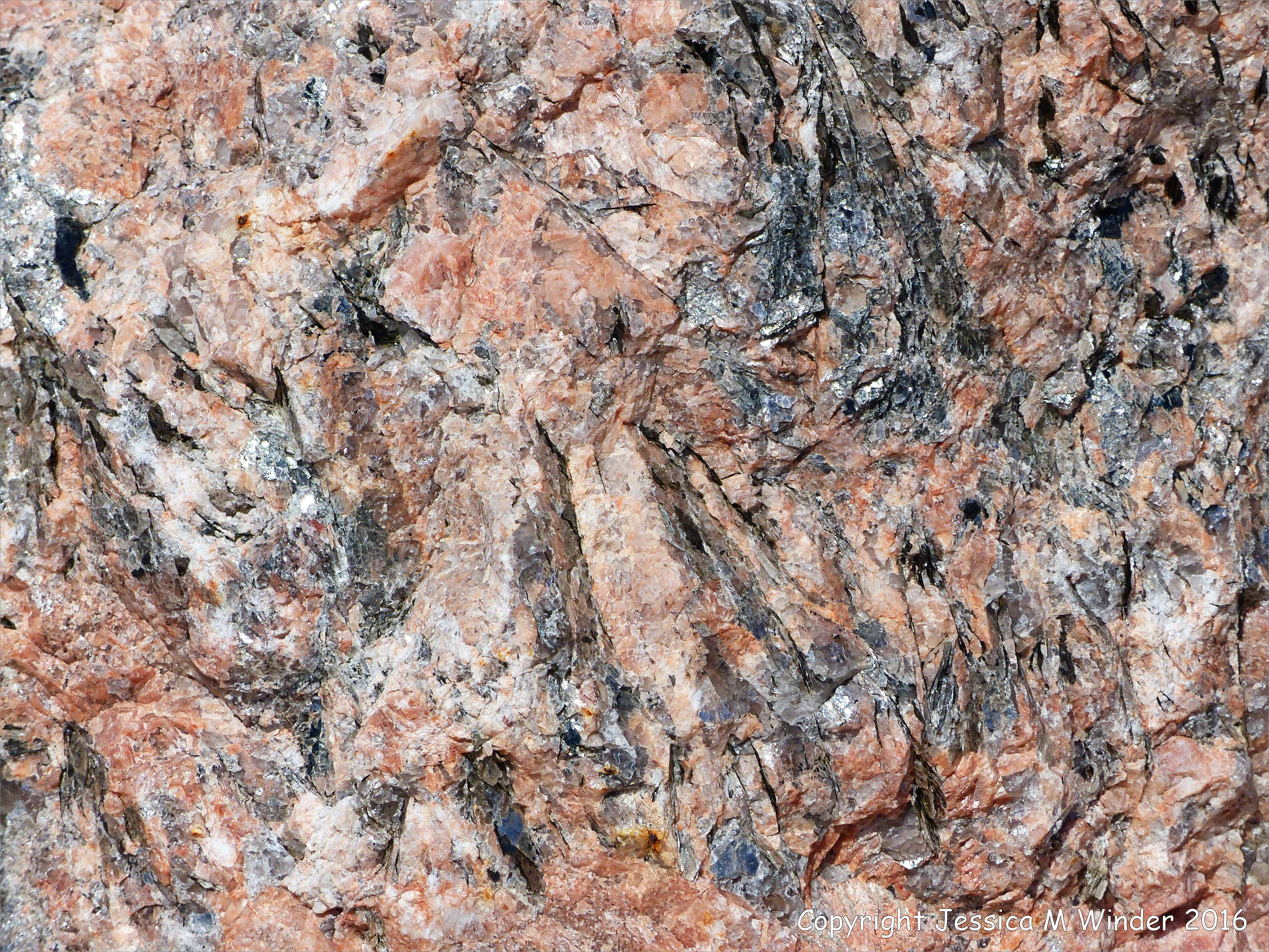 Rock Texture & Pattern at White Point 38 – Macro-photograph of texture and pattern in Devonian plutonic rocks used as rip-rap at White Point harbour in Cape Breton Island, Nova Scotia, Canada, on the Cabot Trail. These rip-rap boulders come from the Black Brook Granitic Suite and include granitic gneiss intruded into biotite schist .