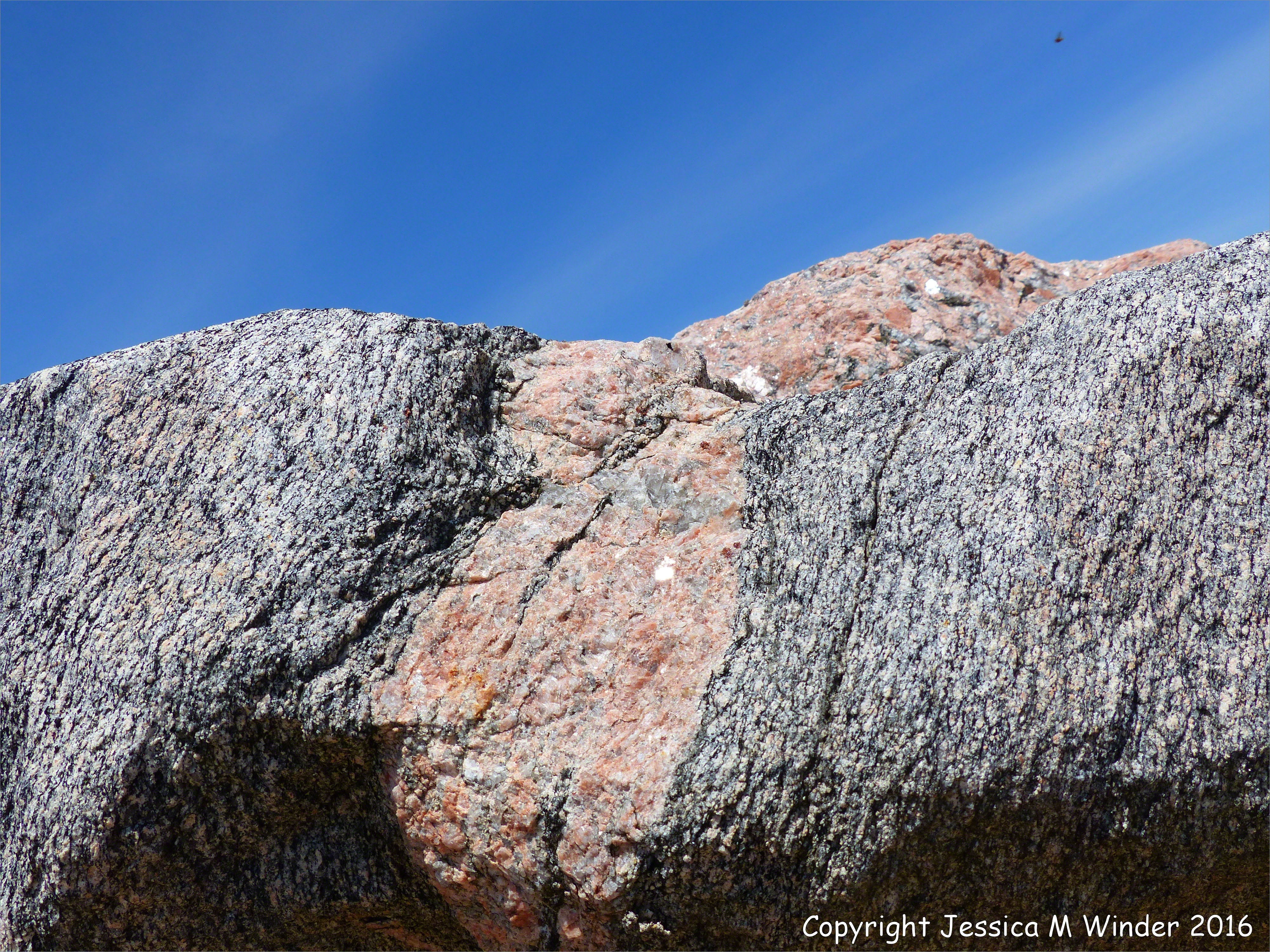 Rock Texture & Pattern at White Point 44 – Texture and pattern in Devonian plutonic rocks used as rip-rap at White Point harbour in Cape Breton Island, Nova Scotia, Canada, on the Cabot Trail. These rip-rap boulders come from the Black Brook Granitic Suite and include granitic gneiss intruded into biotite schist .