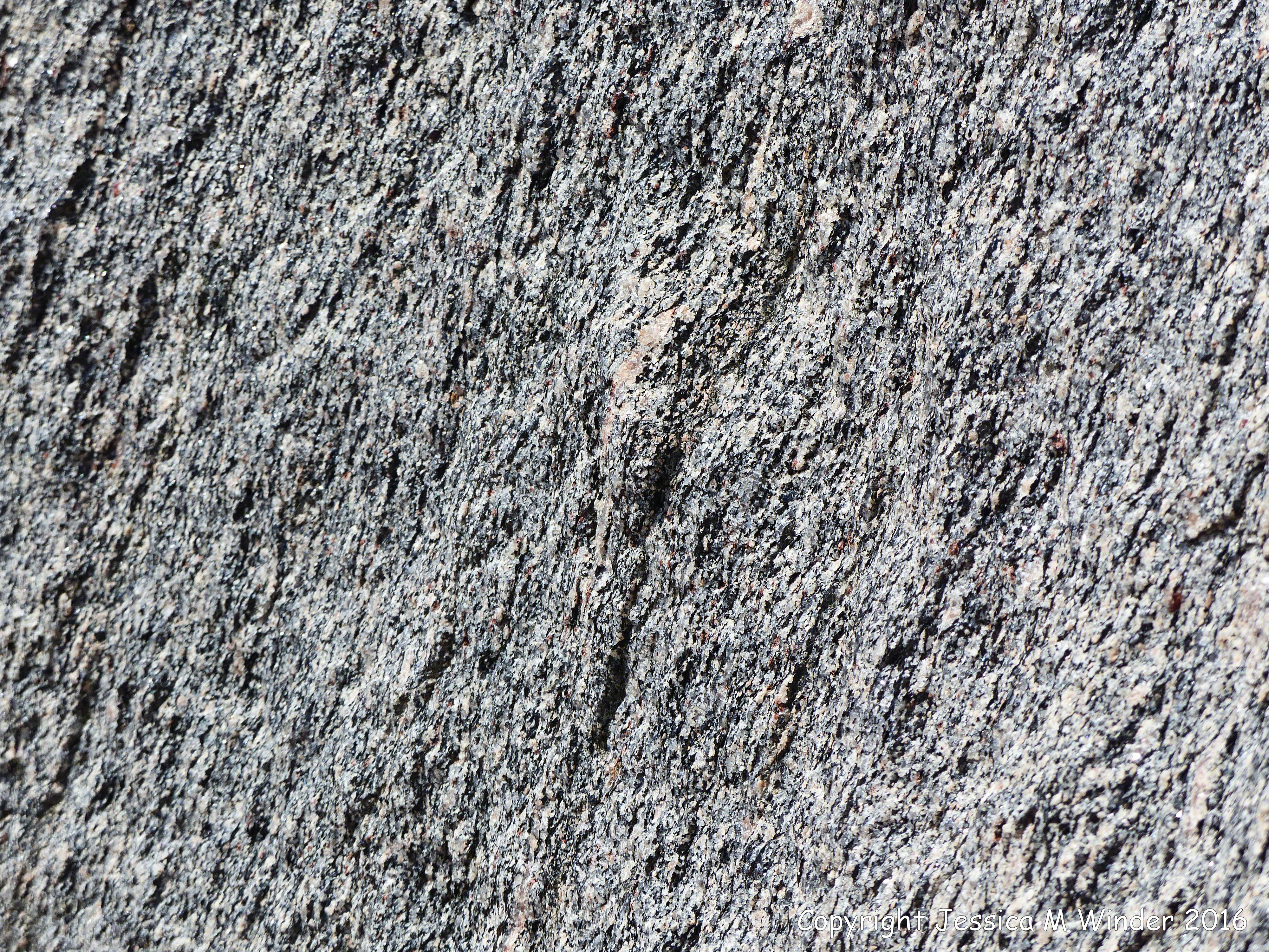 Rock Texture & Pattern at White Point 45 – Macro-photograph of texture and pattern in Devonian plutonic rocks used as rip-rap at White Point harbour in Cape Breton Island, Nova Scotia, Canada, on the Cabot Trail. These rip-rap boulders come from the Black Brook Granitic Suite and include granitic gneiss intruded into biotite schist .