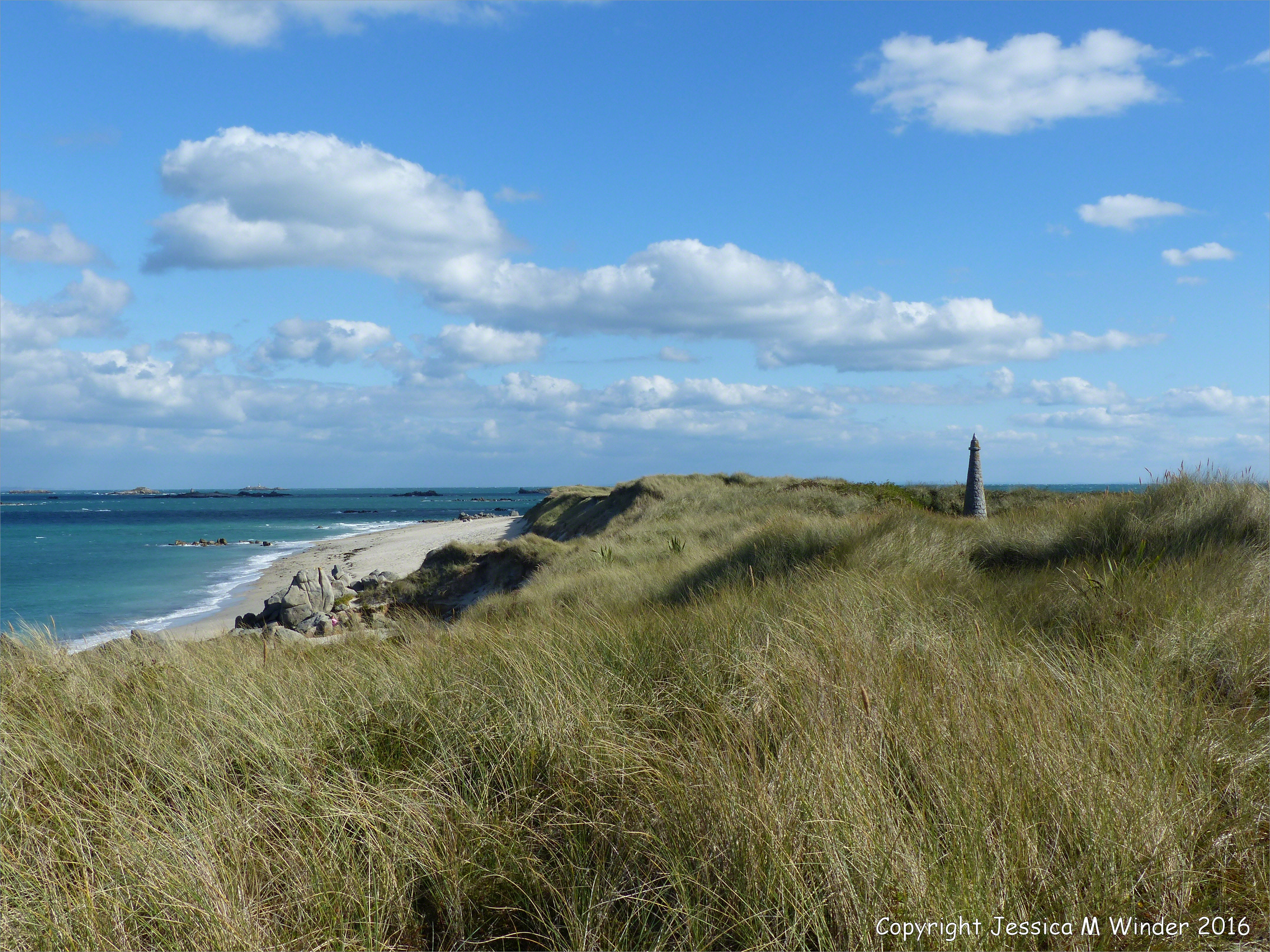 Herm Granodiorite with Xenoliths 1 – The obelisk on the marram covered dunes at Mouisonniere Beach on the Channel Island of Herm