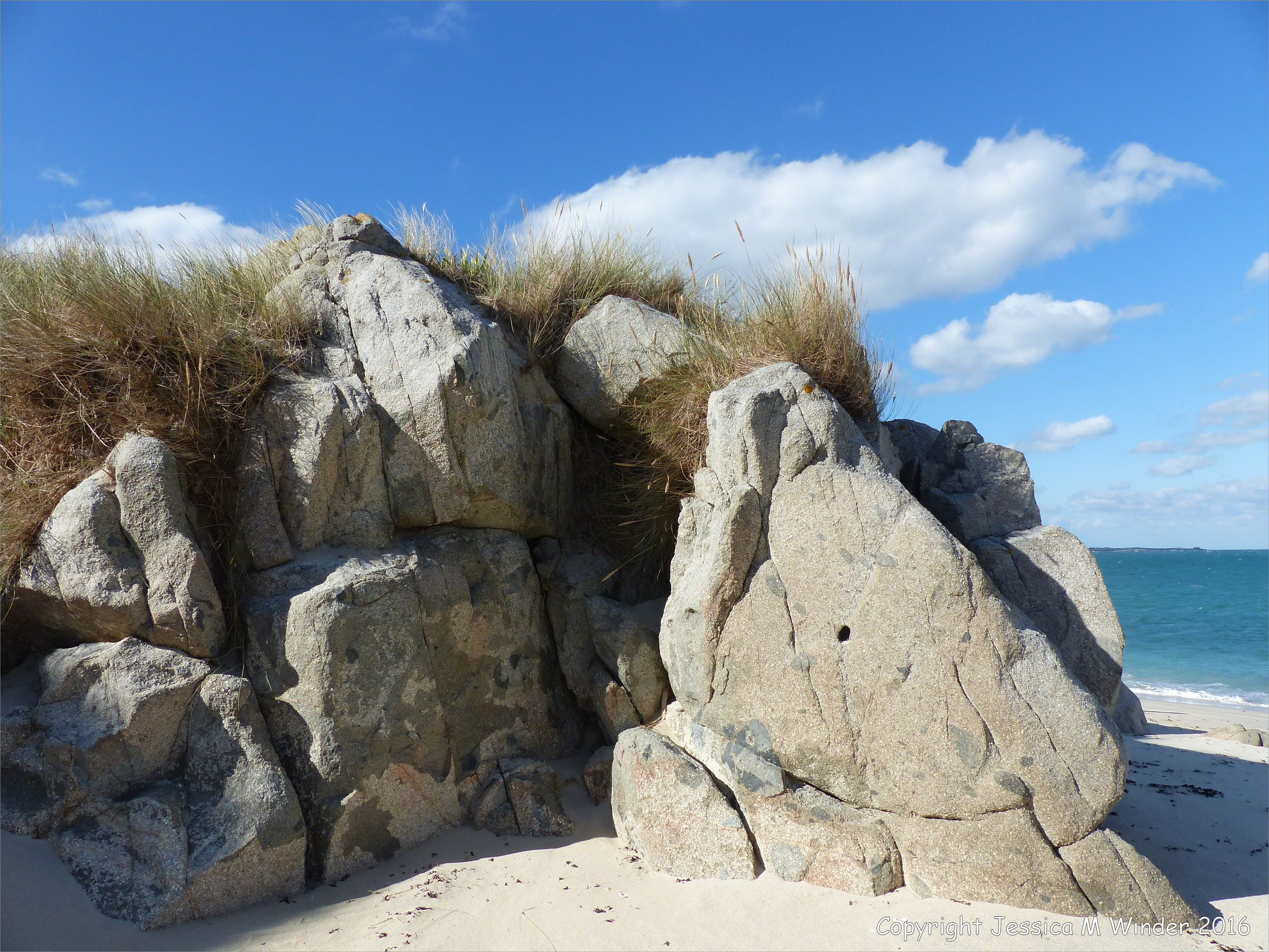 Herm Granodiorite with Xenoliths 6 – Rocky outcrop of Herm Granodiorite with xenoliths on Mouisonniere Beach, Herm Island, Channel Islands.