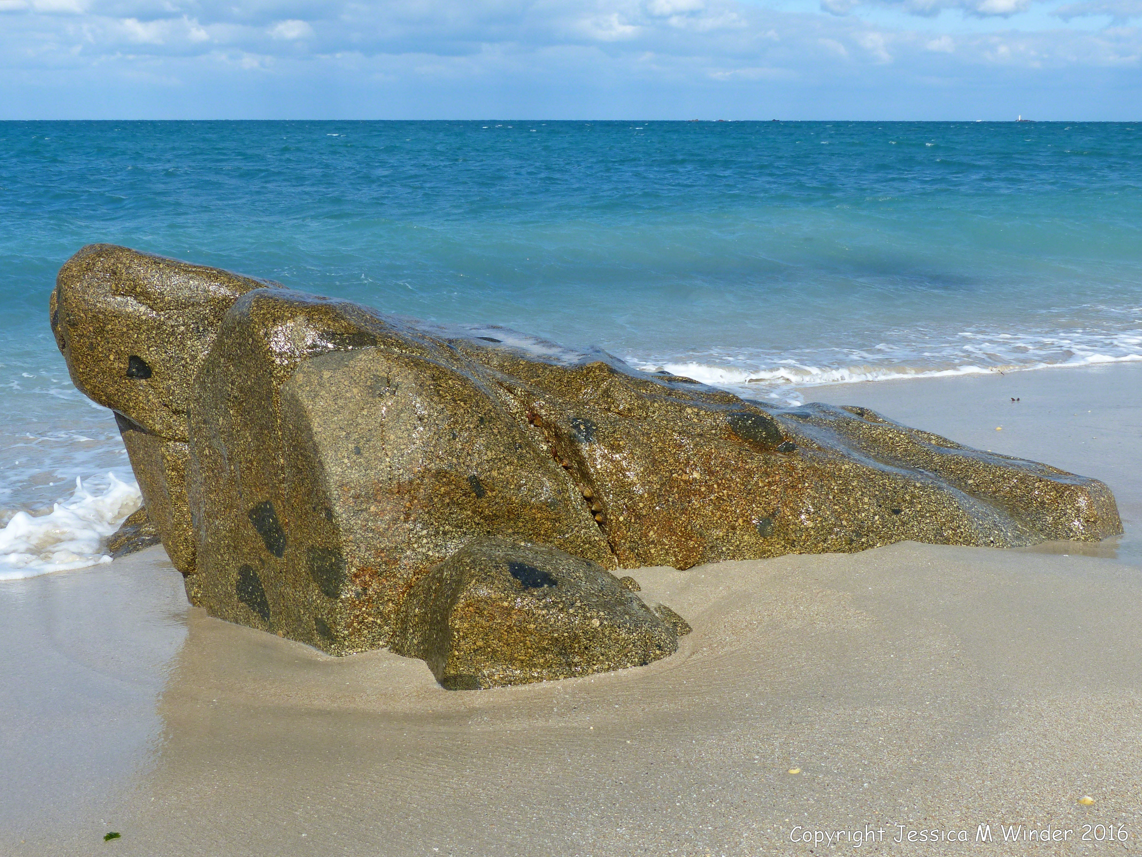 Herm Granodiorite with Xenoliths 30 – Rocky outcrop of Herm Granodiorite with xenoliths on Mouisonniere Beach, Herm Island, Channel Islands.