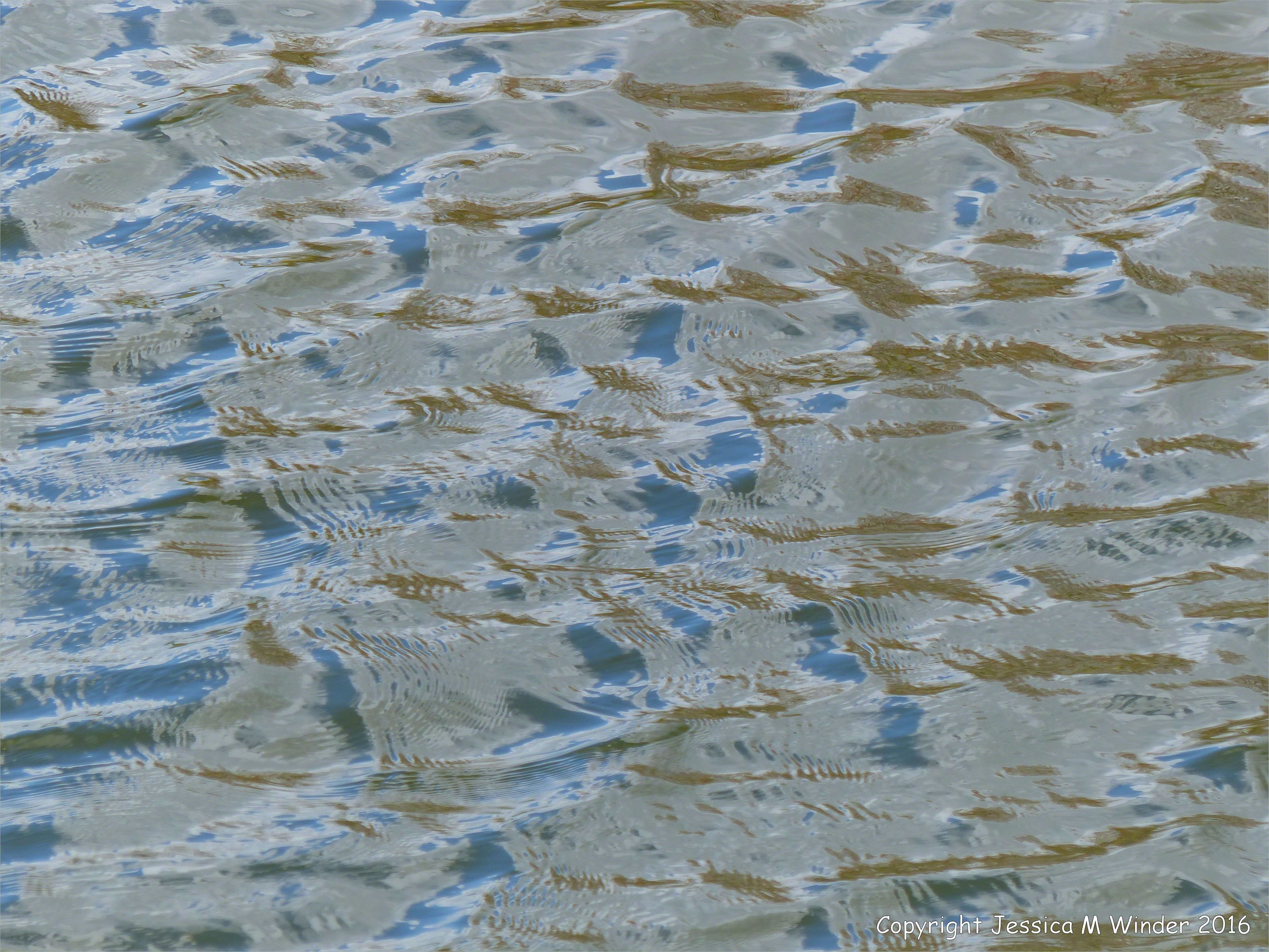 Visit to Crystal Cliffs Beach 27 – Wind-rippled water at Ogden’s Pond with natural patterns of reflection from the blue sky and white clouds. Crystal Cliffs Beach, Nova Scotia, Canada.