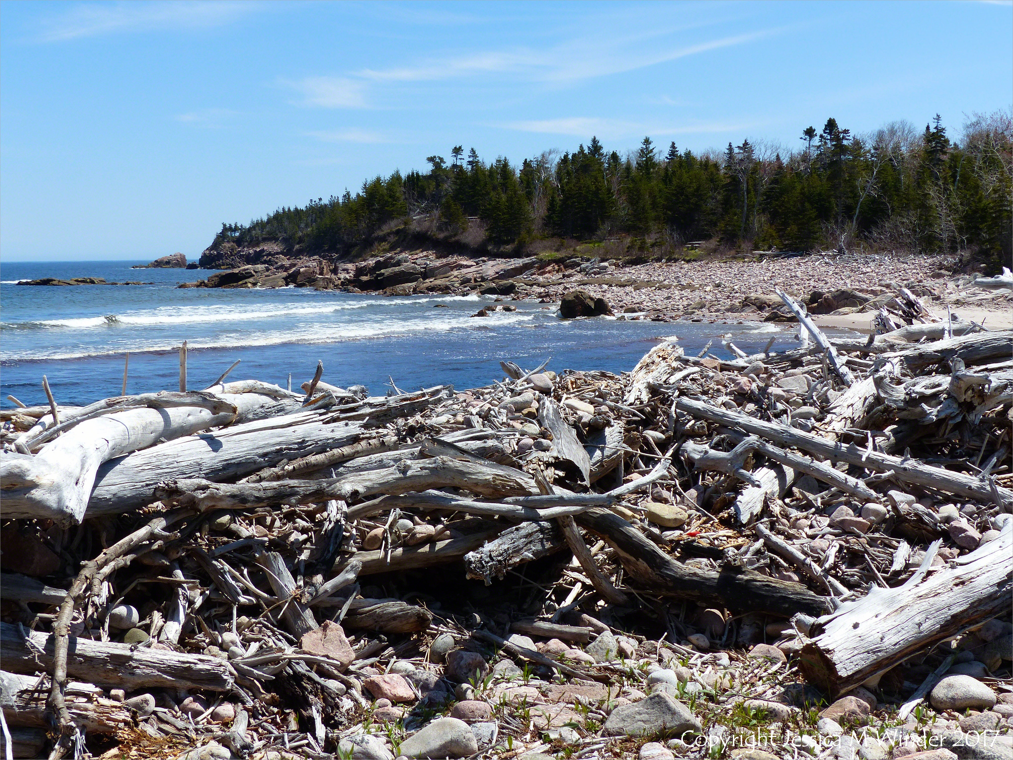 Rock Pattern & Texture at Black Brook Cove 2 – Large driftwood piled high on the banks of the Black Brook river estuary at Black Brook Cove along the Cabot Trail, Cape Breton Island, Nova Scotia, Canada.