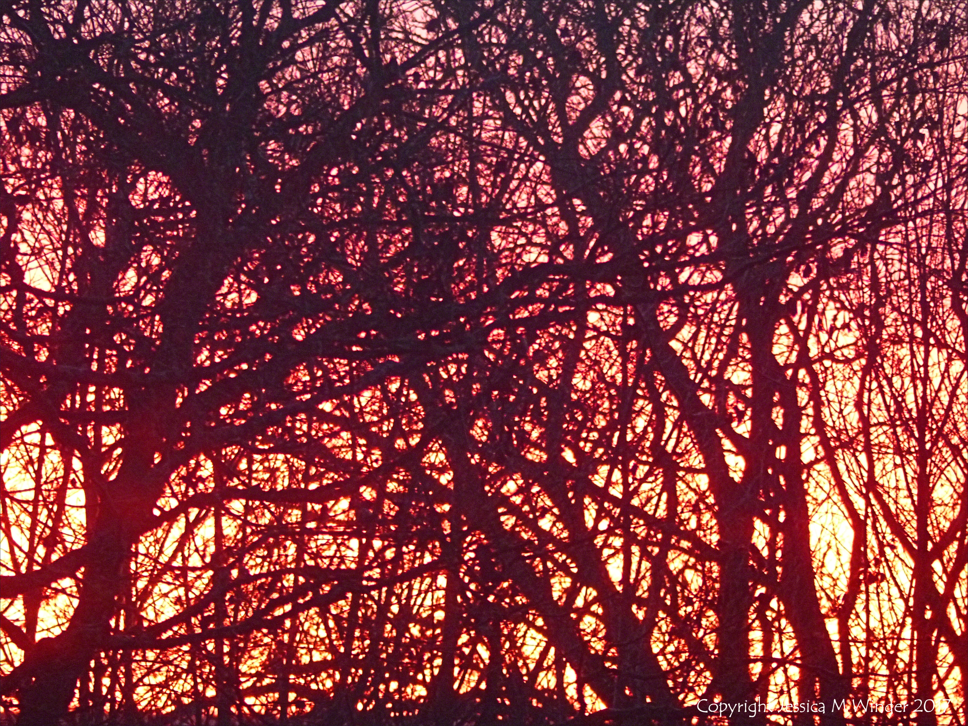 Winter Dawn 3 – Red sky at sunrise with silhouetted bare branches of winter trees.