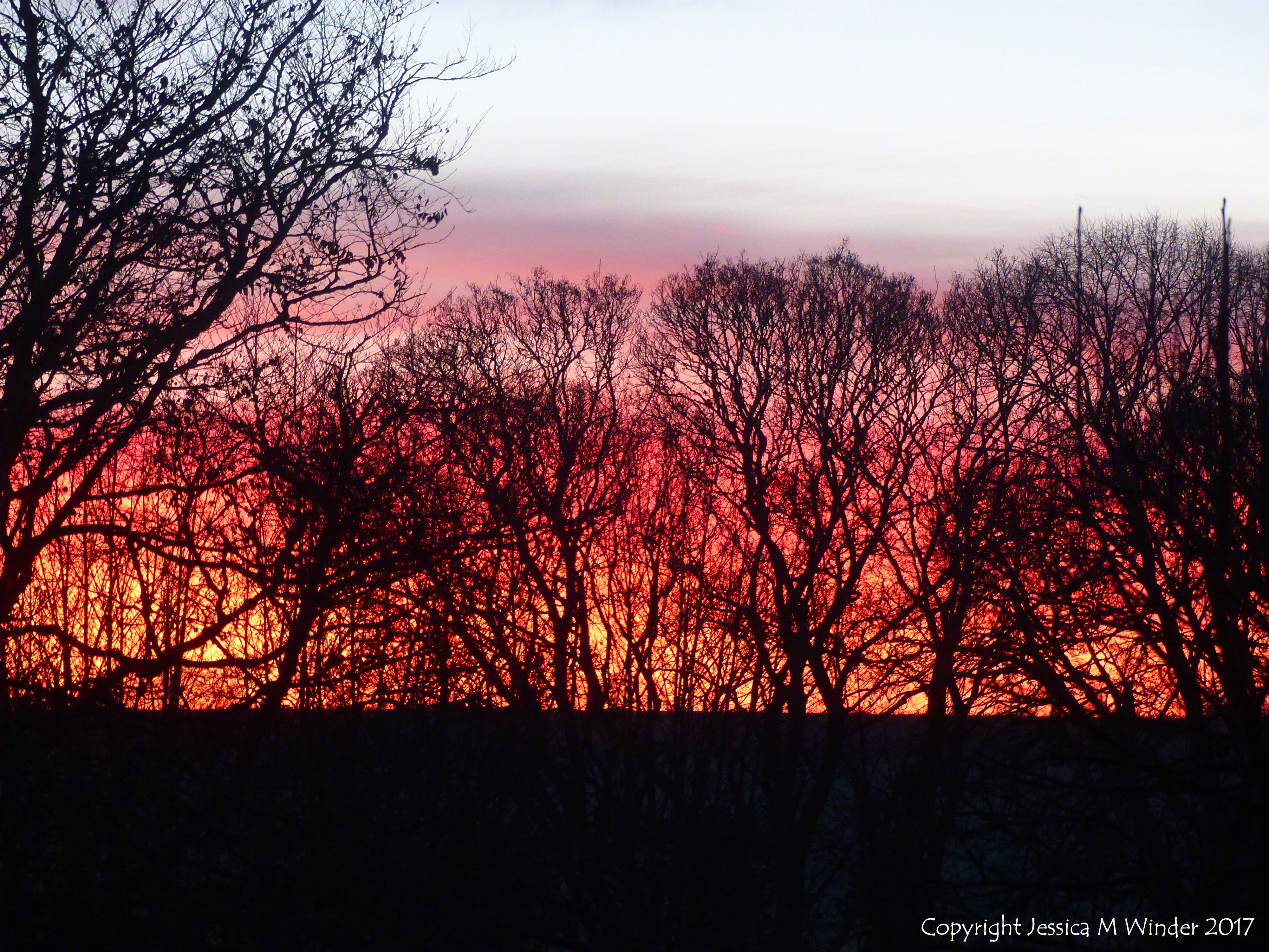 Winter Dawn 5 – Red sky at sunrise with silhouetted bare branches of winter trees.