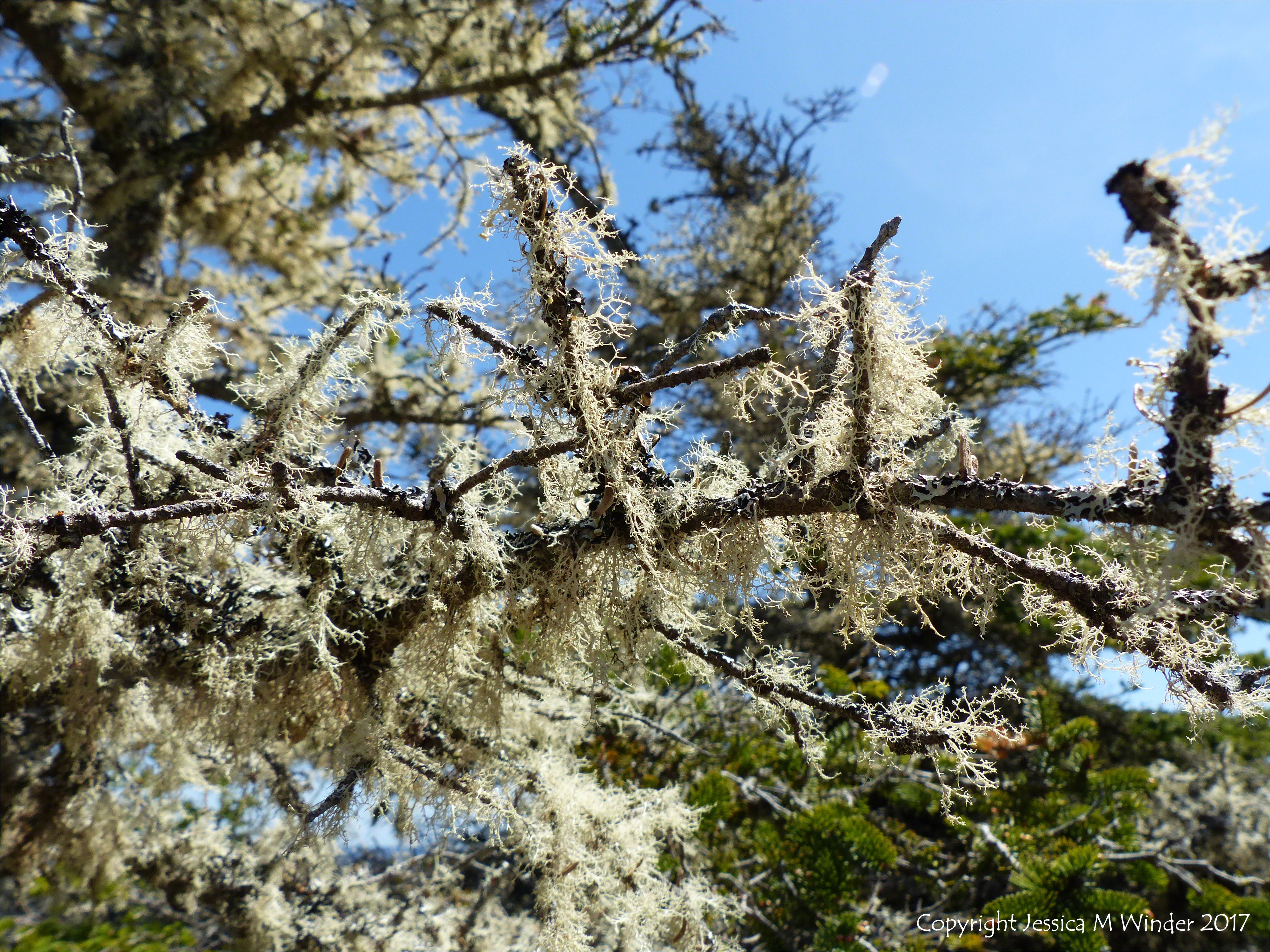 Walk to Morning Star Cove 20 – Lichen growing on bare branches of conifer trees along the Louisbourg Lighthouse Trail near Morning Star Cove on Cape Breton Island, Nova Scotia, Canada, 2 June 2016.
