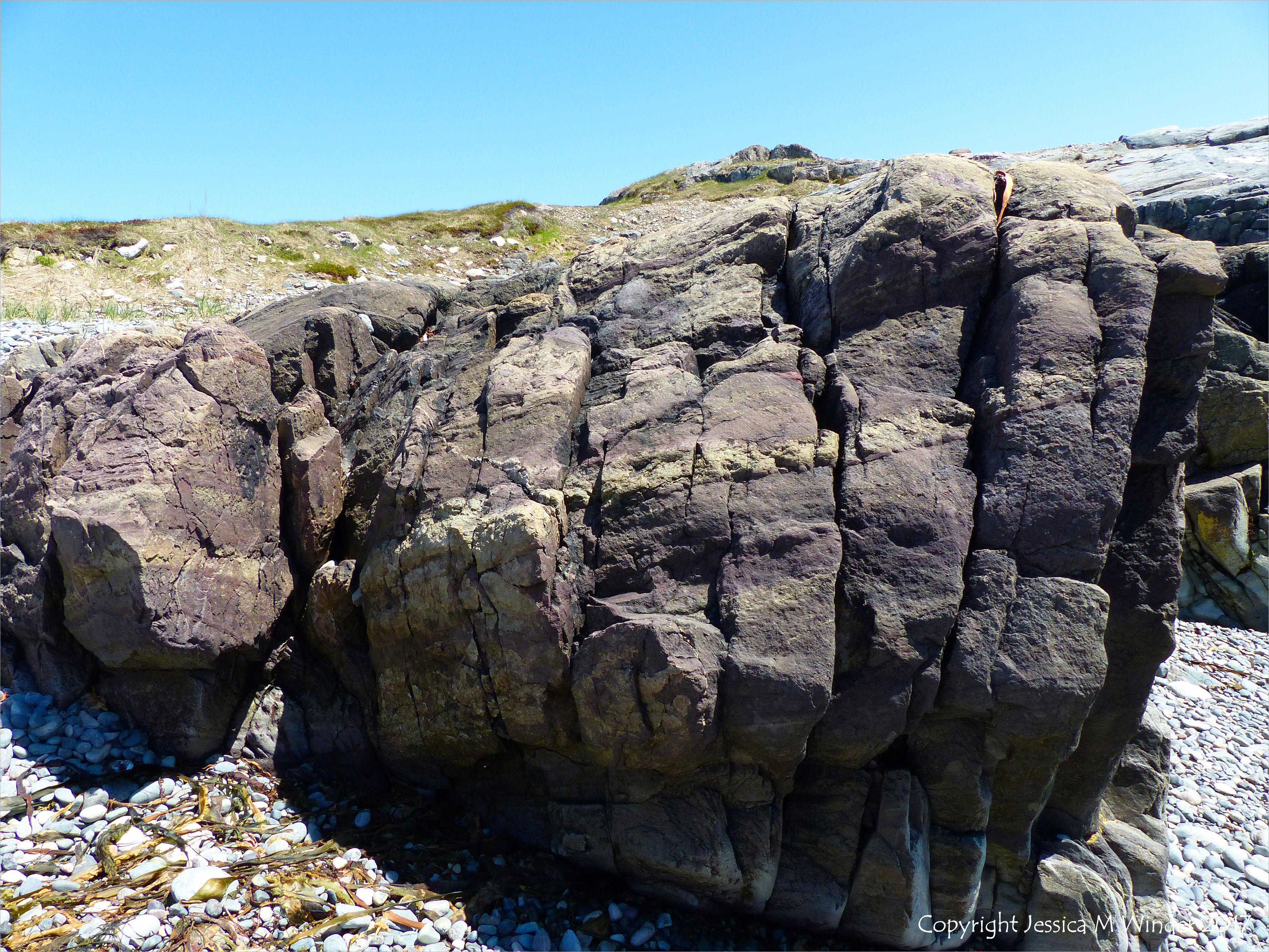 Walk to Morning Star Cove 24 – Outcrop of layered tuff composed of volcanic ash fron the Precambrian period along the Louisbourg Lighthouse Trail near Morning Star Cove on Cape Breton Island, Nova Scotia, Canada, 2 June 2016.
