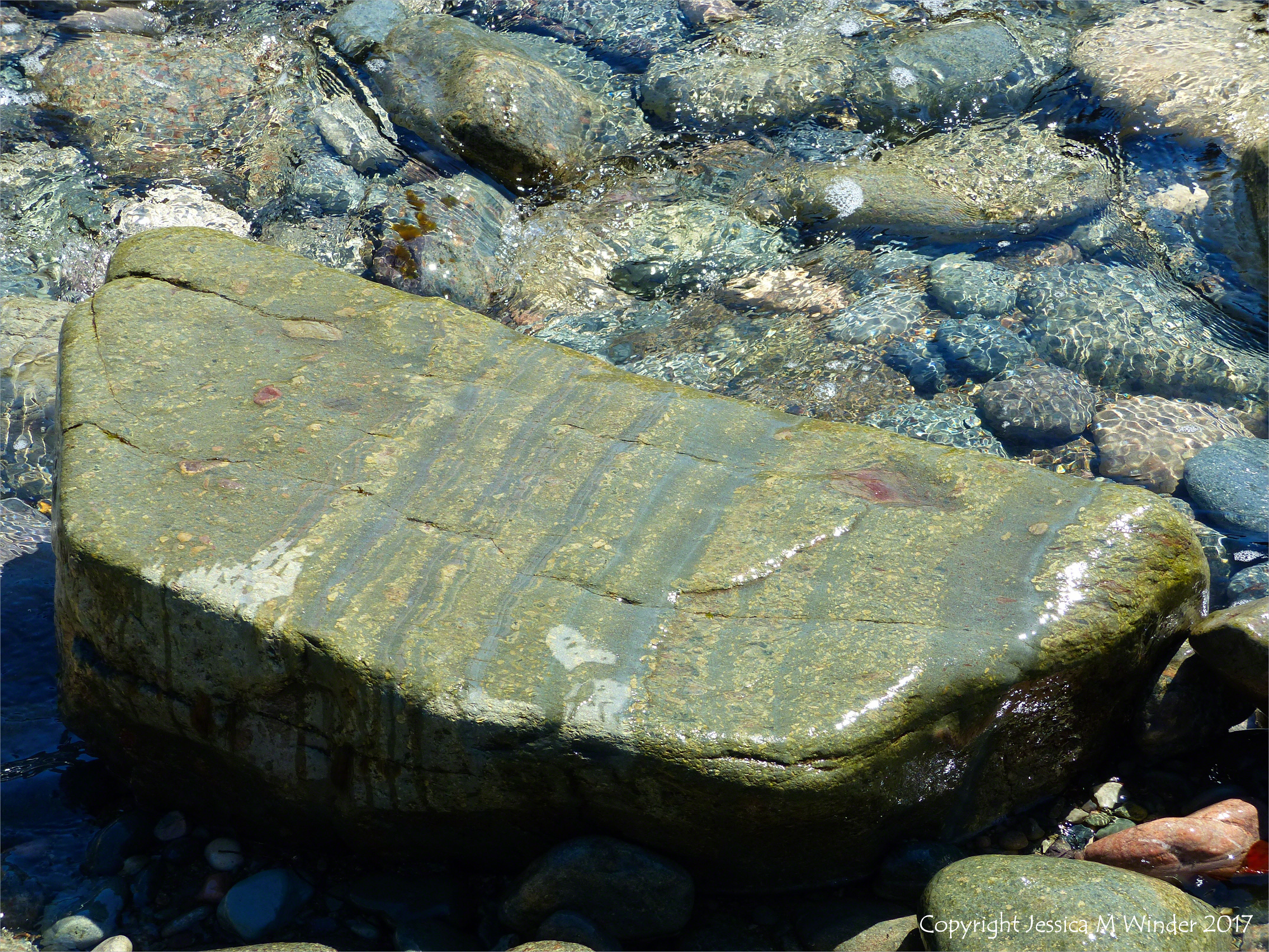 Walk to Morning Star Cove 25 – Boulder of layered volcanic ash or tuff at Morning Star Cove along the Louisbourg Lighthouse Trail on Cape Breton Island, Nova Scotia, Canada, 2 June 2016.