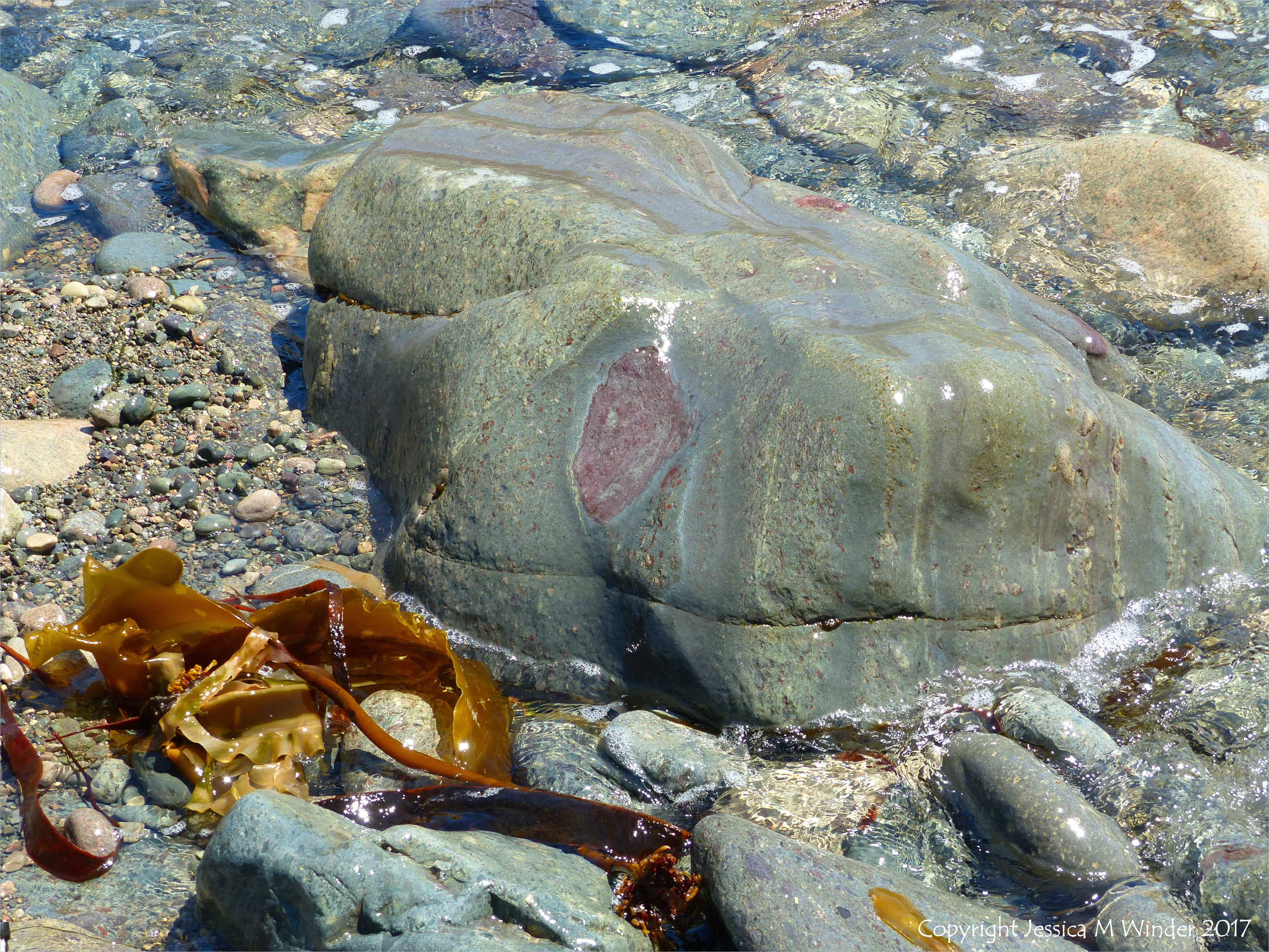 Walk to Morning Star Cove 28 – Wet boulder of Precambrian volcanic tuff from the Main a Dieu Sequence at Morning Star Cove along the Louisbourg Lighthouse Trail on Cape Breton Island, Nova Scotia, Canada, 2 June 2016.