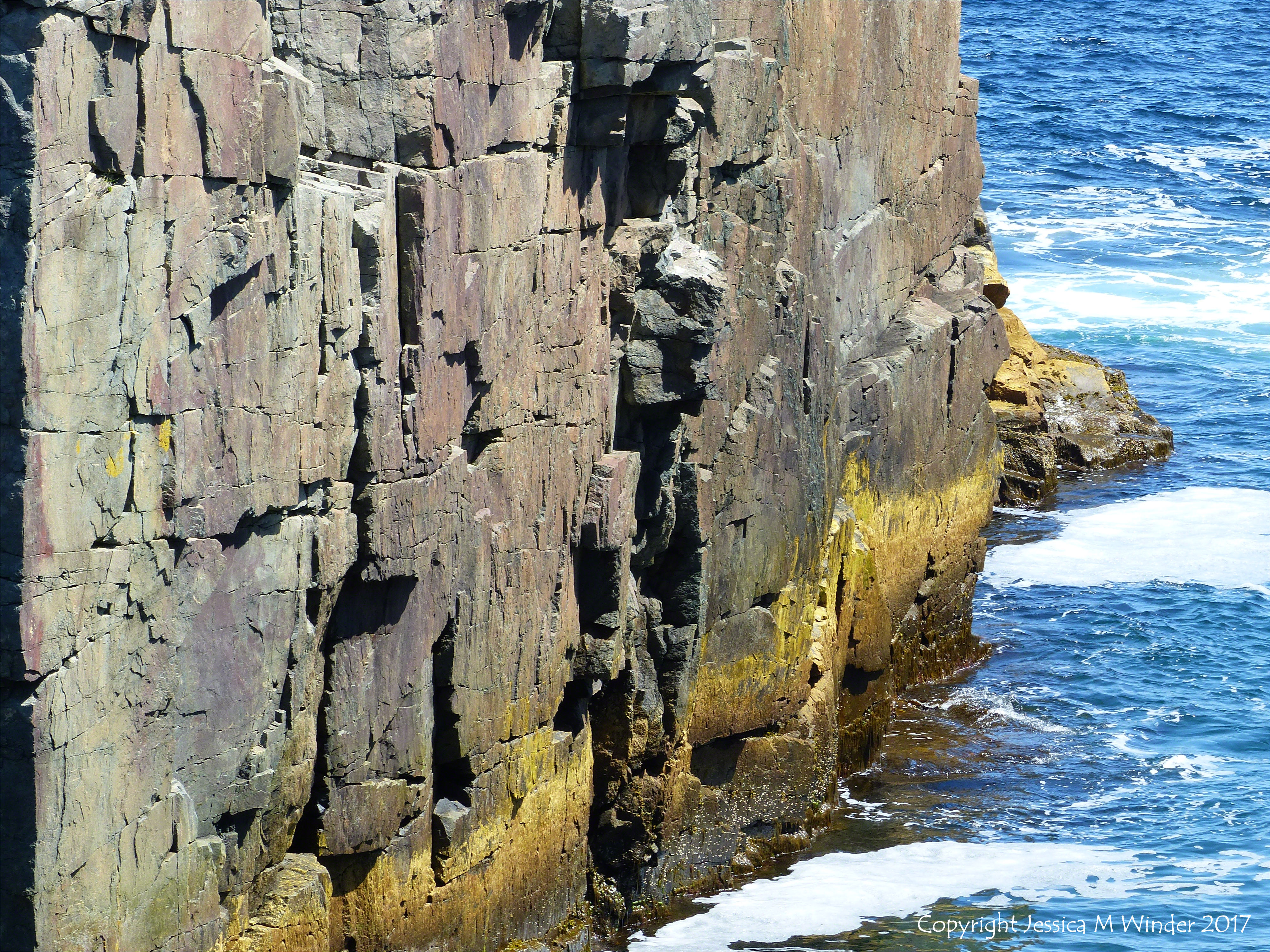 Walk to Morning Star Cove 32 – Vertically aligned strata of Precambrian volcanic tuff from the Main a Dieu Sequence along the Louisbourg Lighthouse Trail near Morning Star Cove on Cape Breton Island, Nova Scotia, Canada, 2 June 2016.