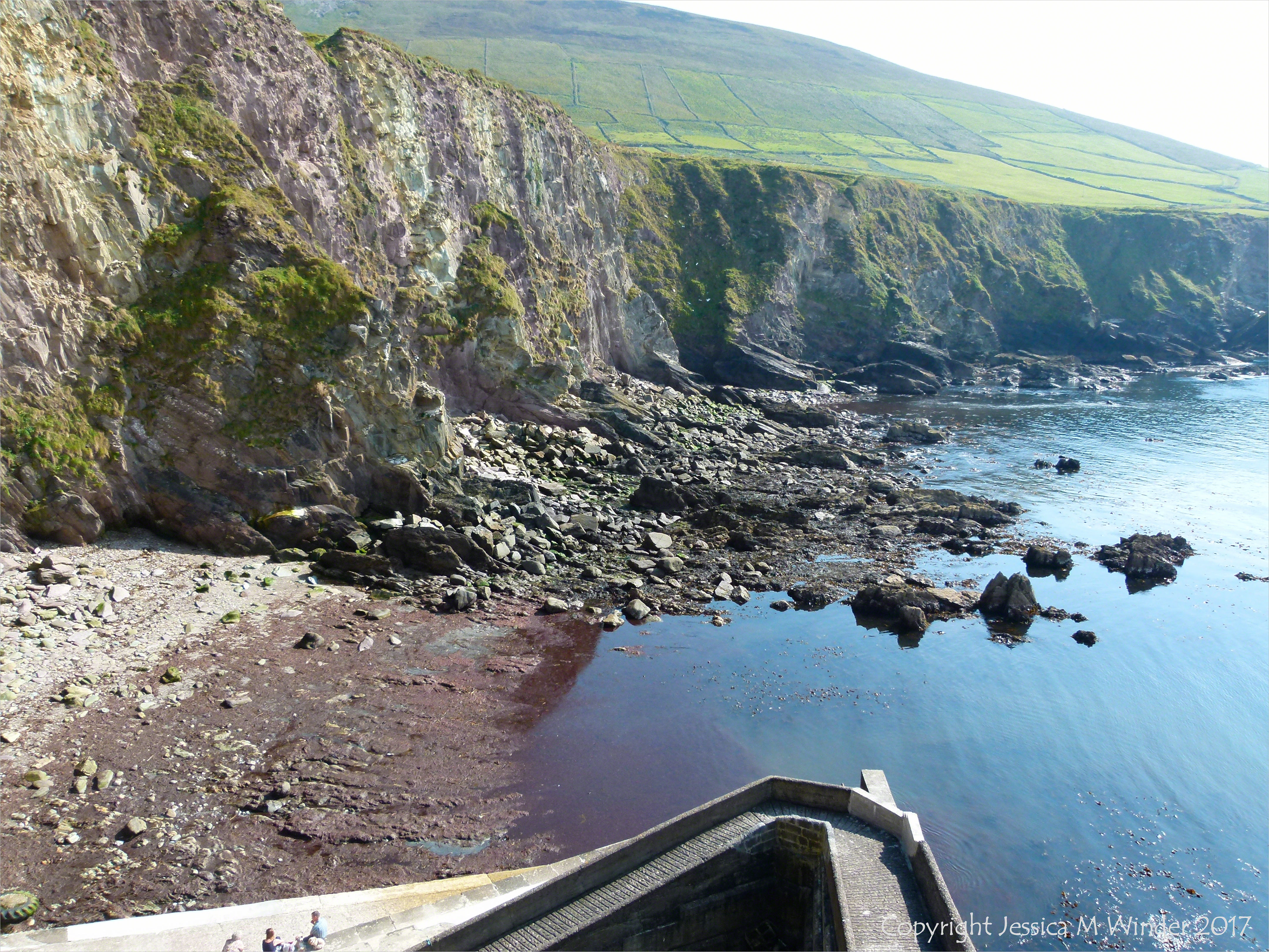 Dunquin Harbour Dingle 9 – View looking down from the zig-zag path to the cliffs and beach at Dunquin Harbour, Dingle, Ireland, where yellow Silurian siltstones of the Drom Point Formation belonging to the marine Dunquin Group meet the sandstones and mudstones of the mostly red and green terrestrial Silurian/Devonian Dingle Group rocks. Hard bands of more resistant rock strata project seawards at intervals along the cliff face.