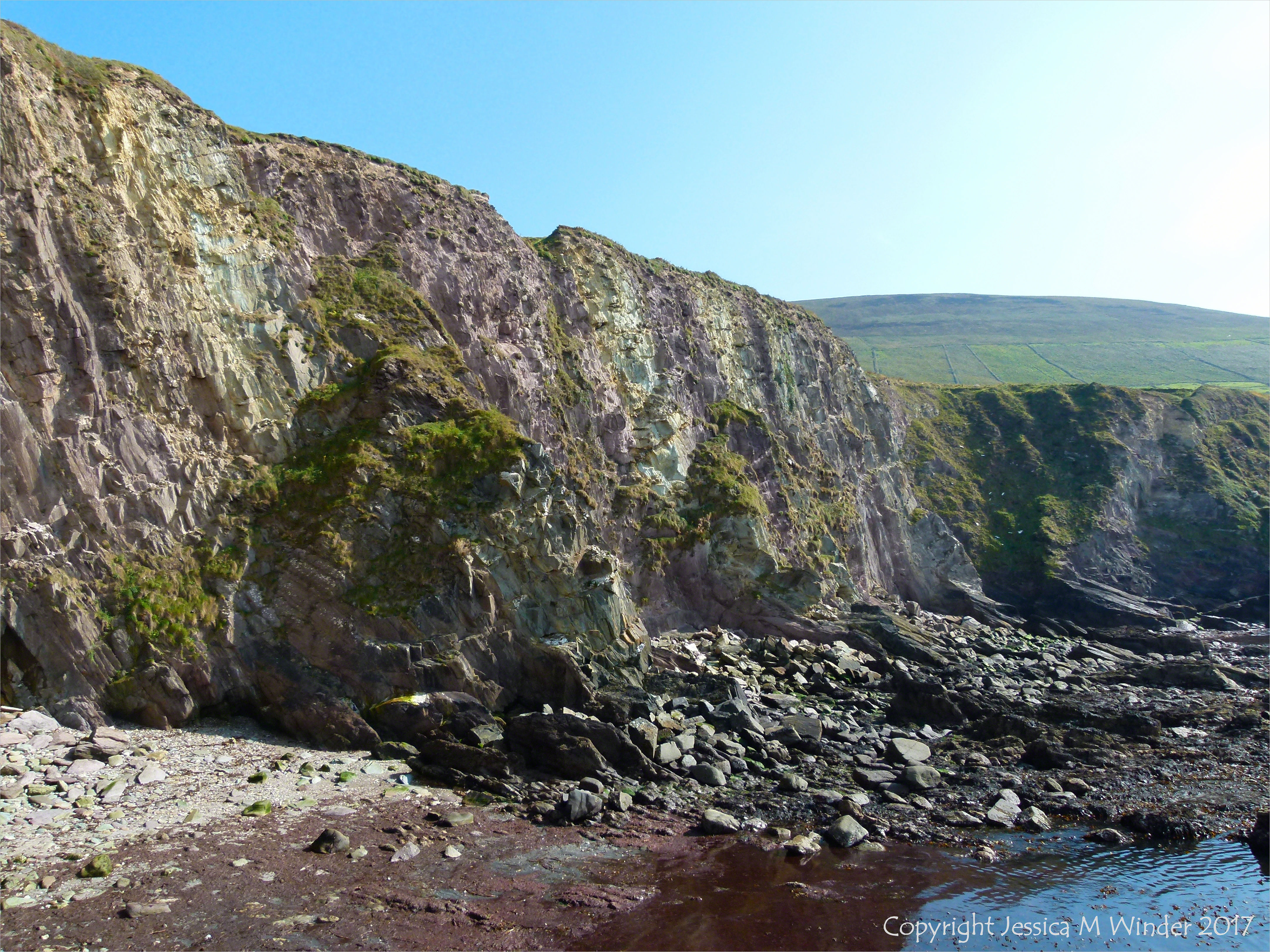 Dunquin Harbour Dingle 10 – Subtle but contrasting purplish and greenish colours of adjacent and steeply inclined Silurian/Devonian rock layers at Dunquin Harbour on the Dingle Peninsula in Ireland. The seawater looks red because of the mat of multi-coloured floating seaweed.