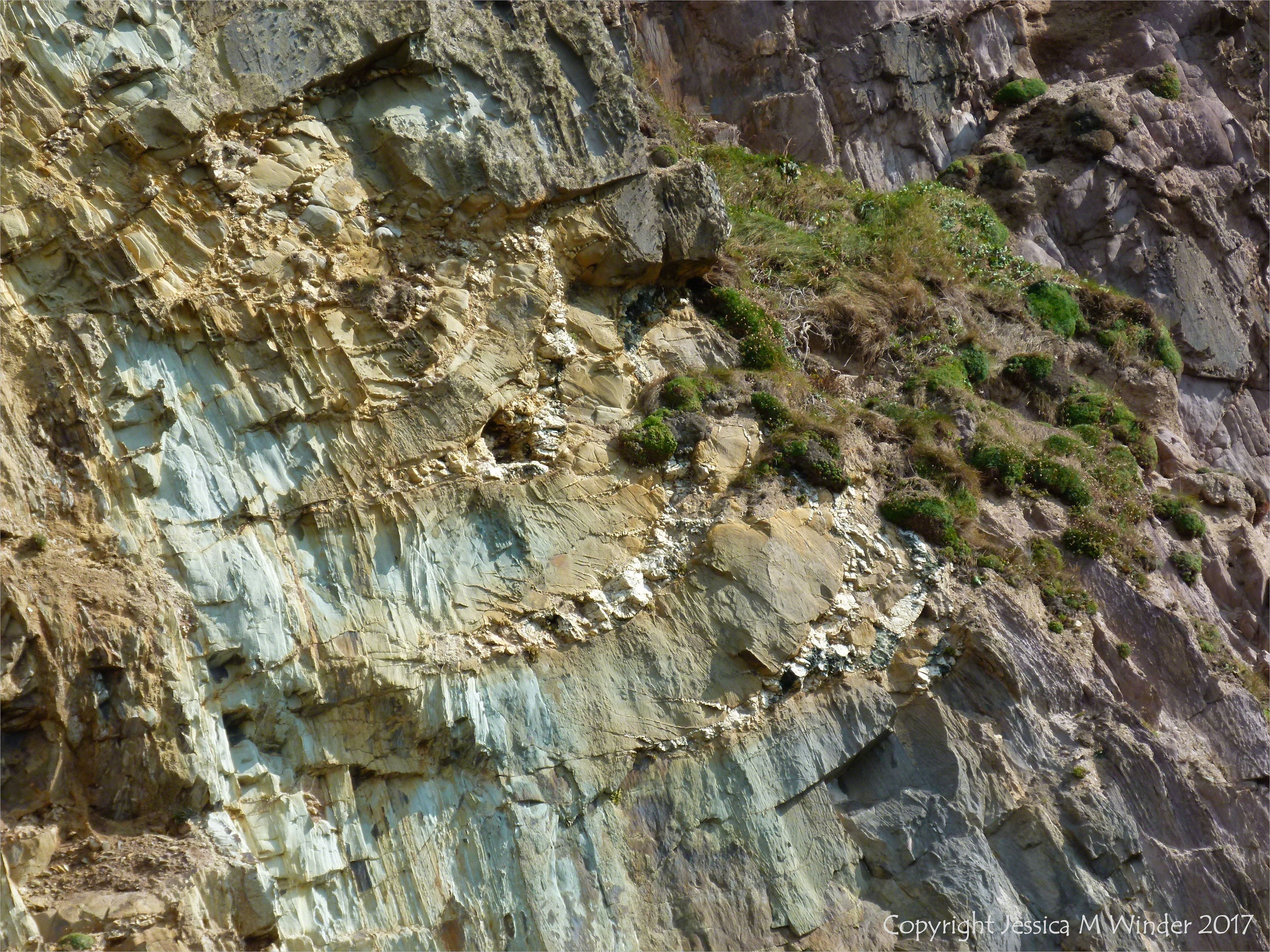 Dunquin Harbour Dingle 21 – Rock face of steeply inclined Silurian/Devonian sedimentary strata cross cut with with quartz veins at Dunquin Harbour, Dingle, Ireland.