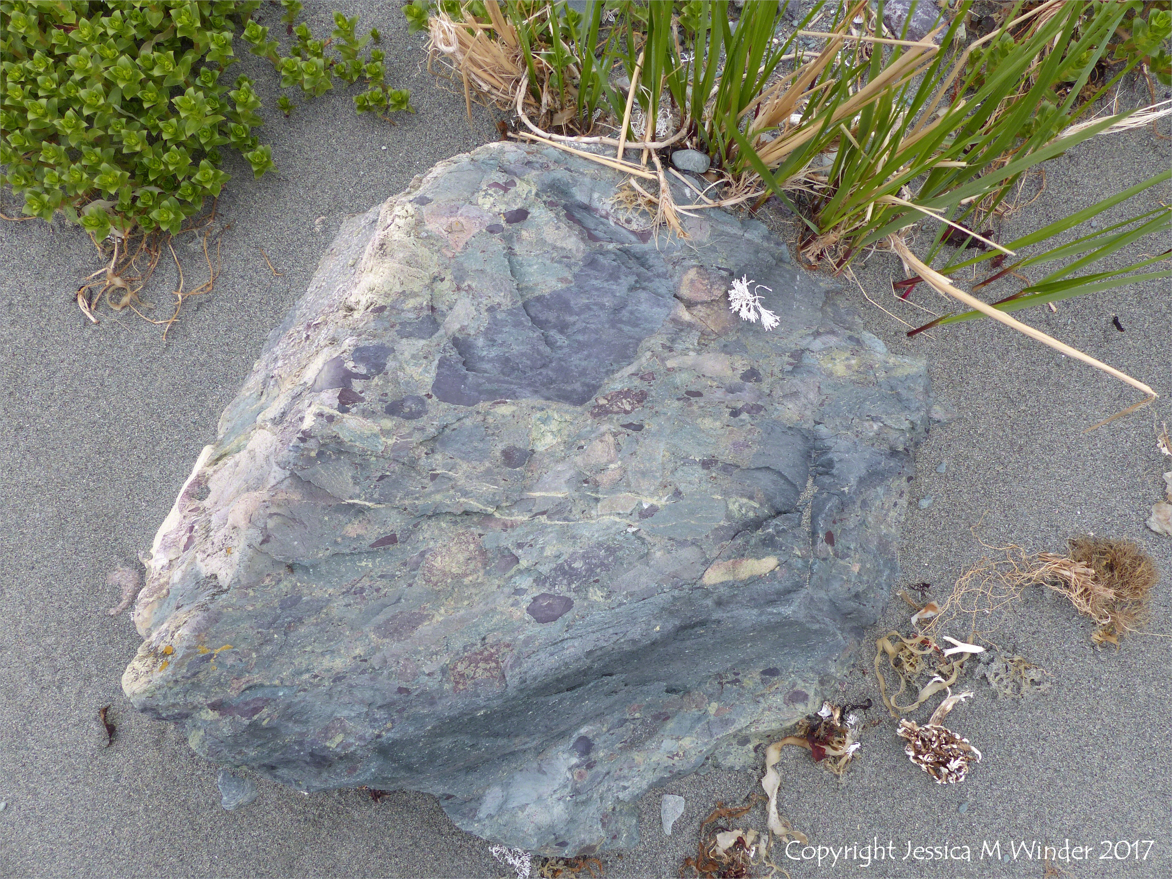 Fourchu Head Rocks 36 – Boulder of Neoproterozoic volcanic rock belonging to the Fourchu Sequence dating from as far back as 570 million years ago, found on the beach at Fourchu Head, Cape Breton Island, Nova Scotia, Canada.