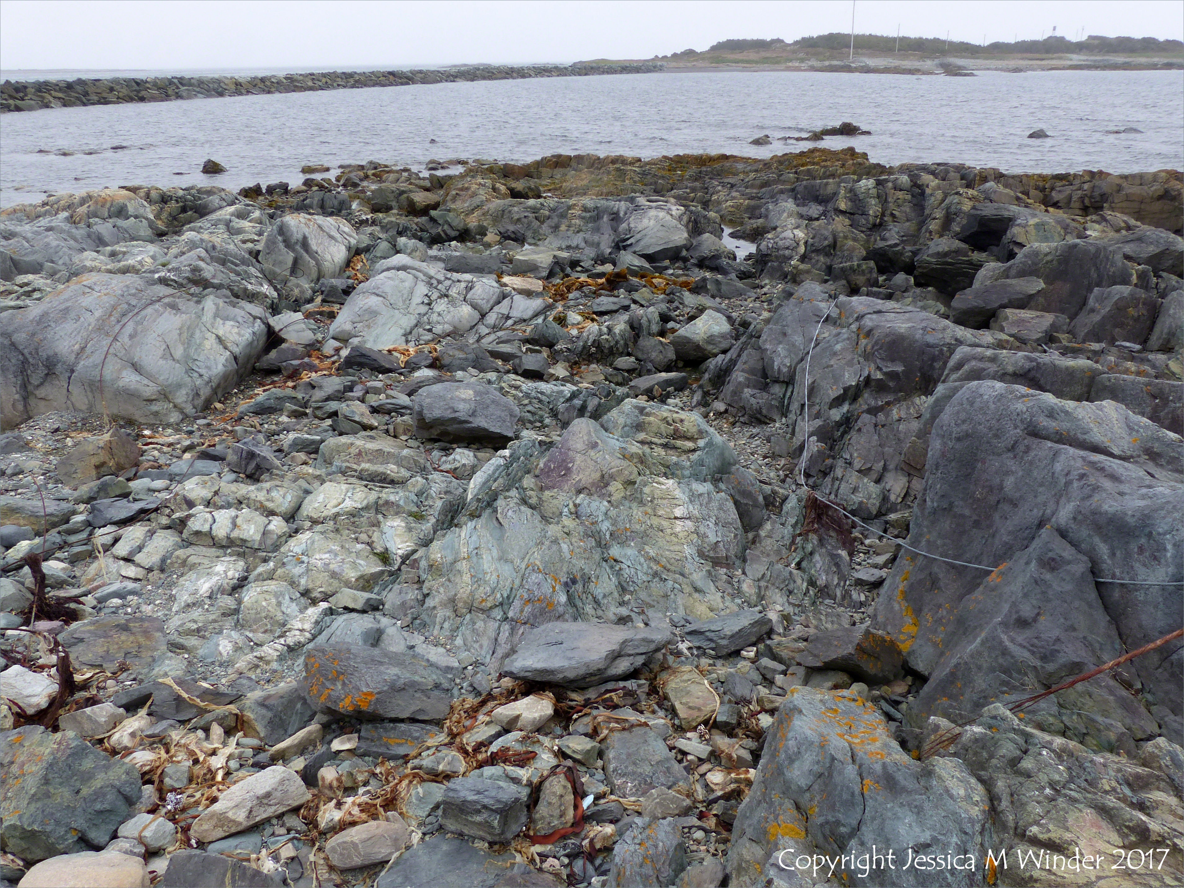 Fourchu Head Rocks 38 – The rocky shore made of Neoproterozoic volcanic rock belonging to the Fourchu Sequence dating from as far back as 570 million years ago, found on the beach at Fourchu Head, Cape Breton Island, Nova Scotia, Canada.