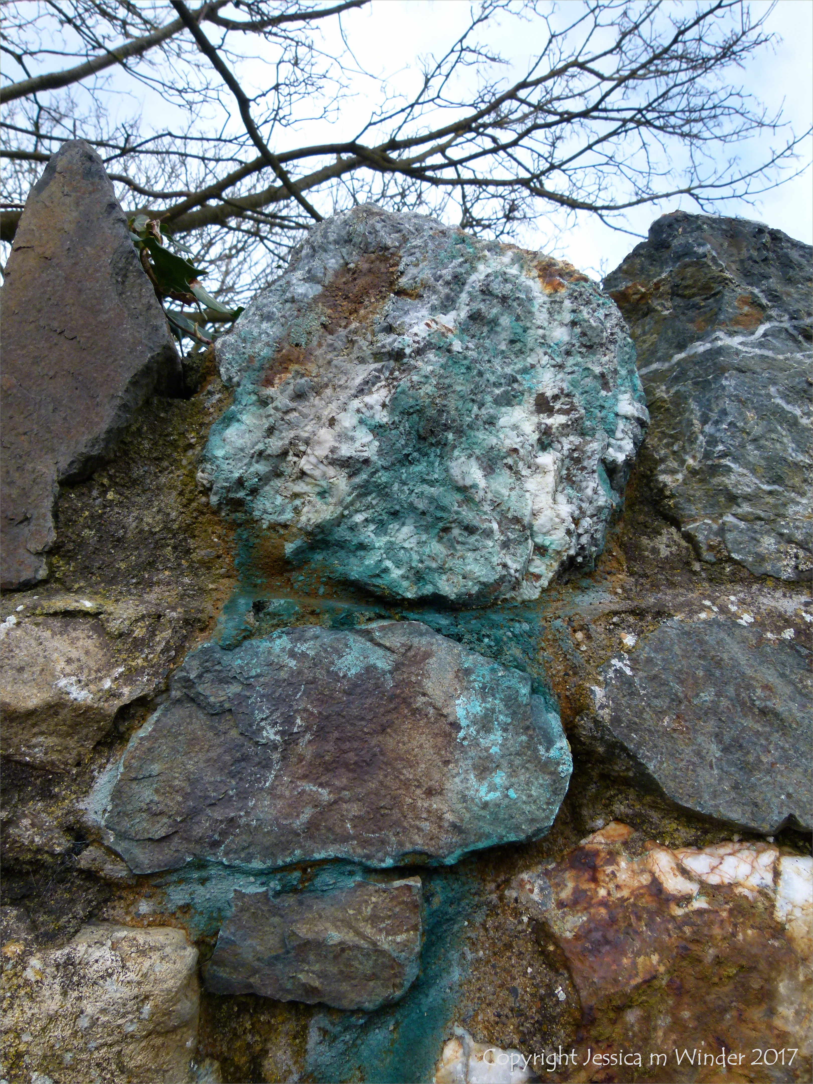 Copper in Bunmahon Rocks 4 – Stone wall with blue copper-stained quartz rock in Bunmahon, in the Copper Coast GeoPark near Cork in Southern Ireland.