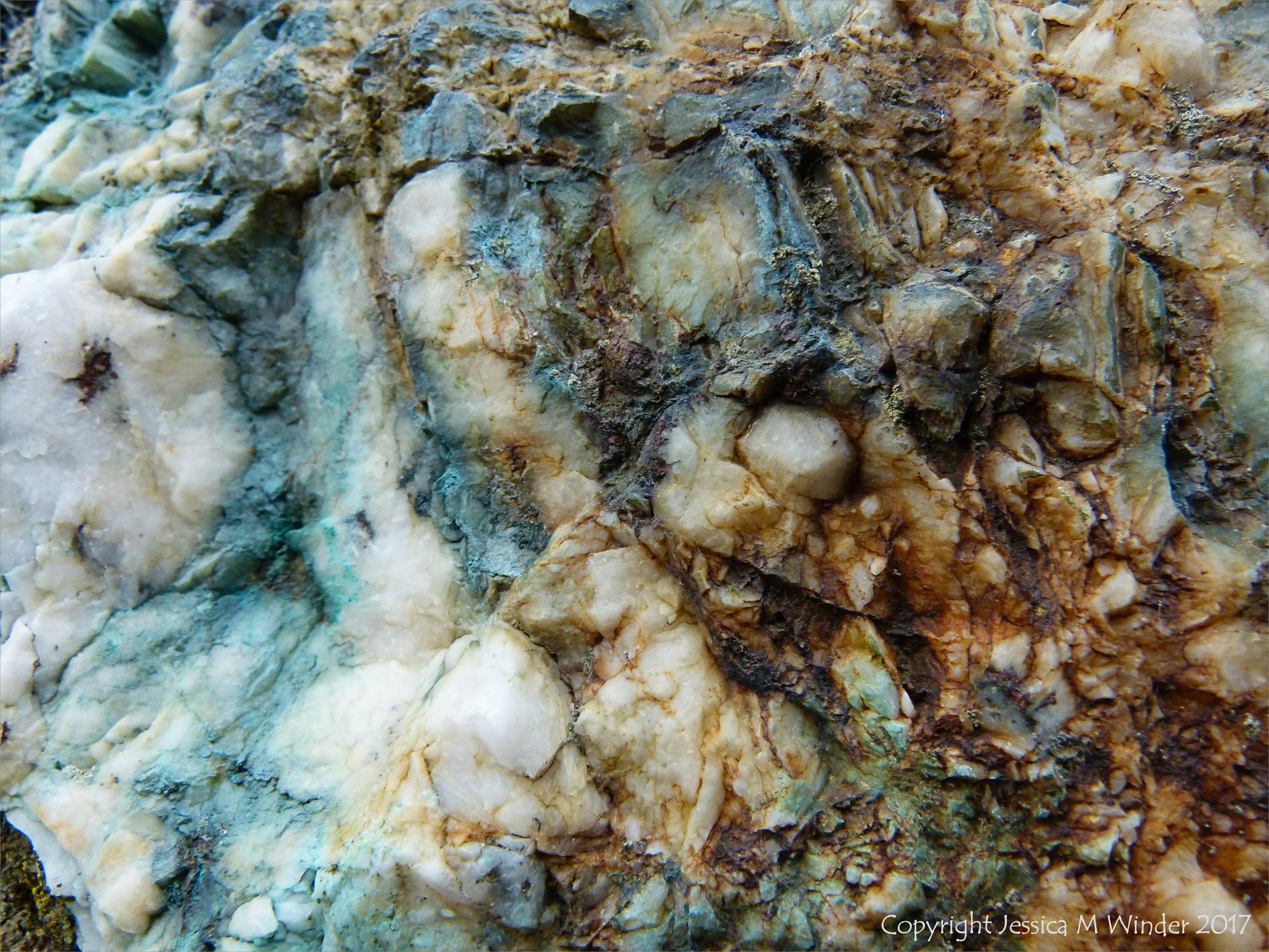 Copper in Bunmahon Rocks 9 – Close-up photograph of colour and texture in white quartz with blue copper minerals in a stone wall at Bunmahon near Cork in the Copper Coast GeoPark on the south coast of Ireland.