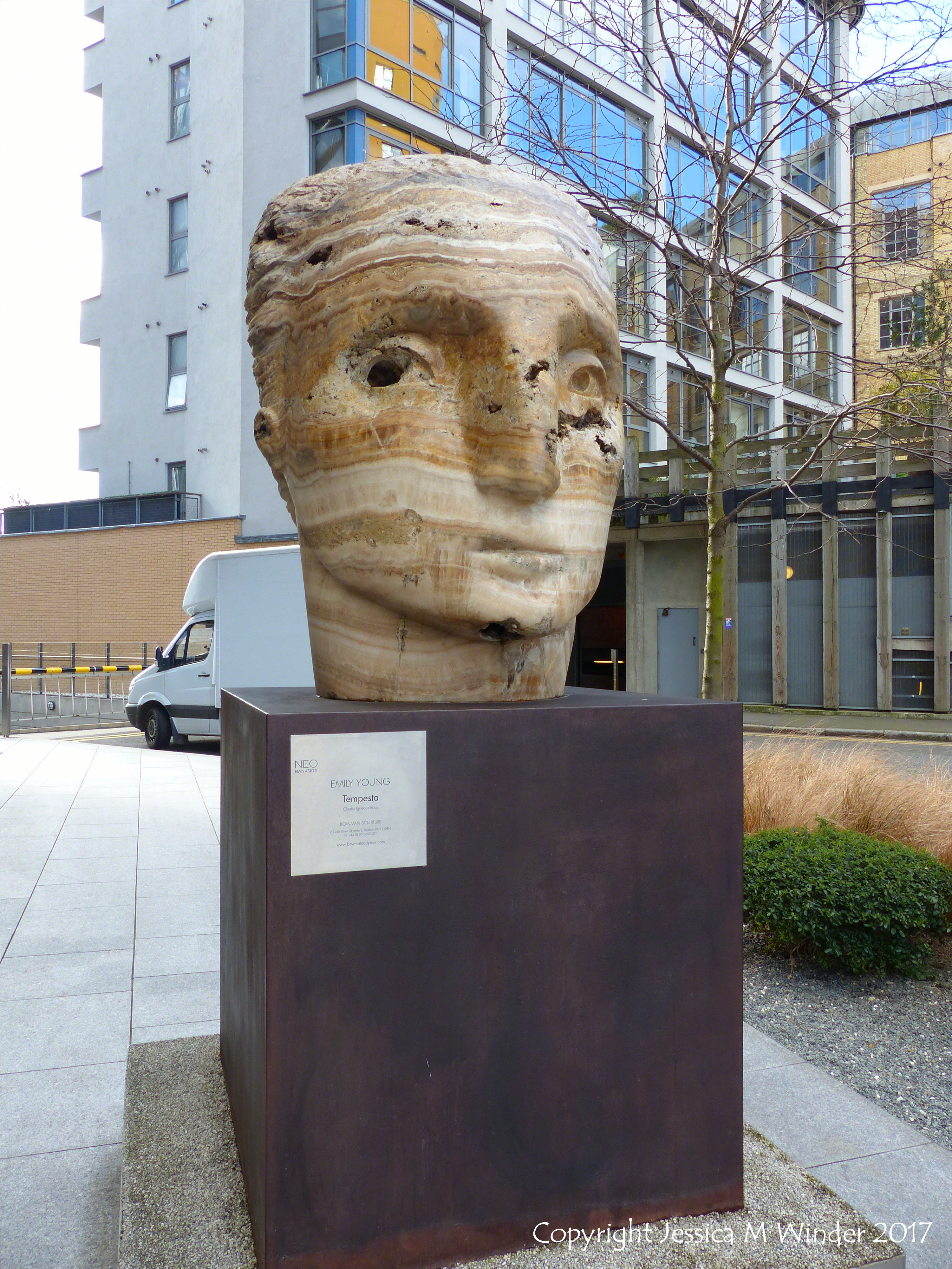 Clastic Igneous Rock 1 Tempesta F – Carved head called Tempesta made from clastic igneous rock by Emily Young (http://www.emilyyoung.com/) and exhibited at Neo Bankside in London behind the Tate Modern Gallery, courtesy of Bowman Sculpture (http://www.bowmansculpture.com/).