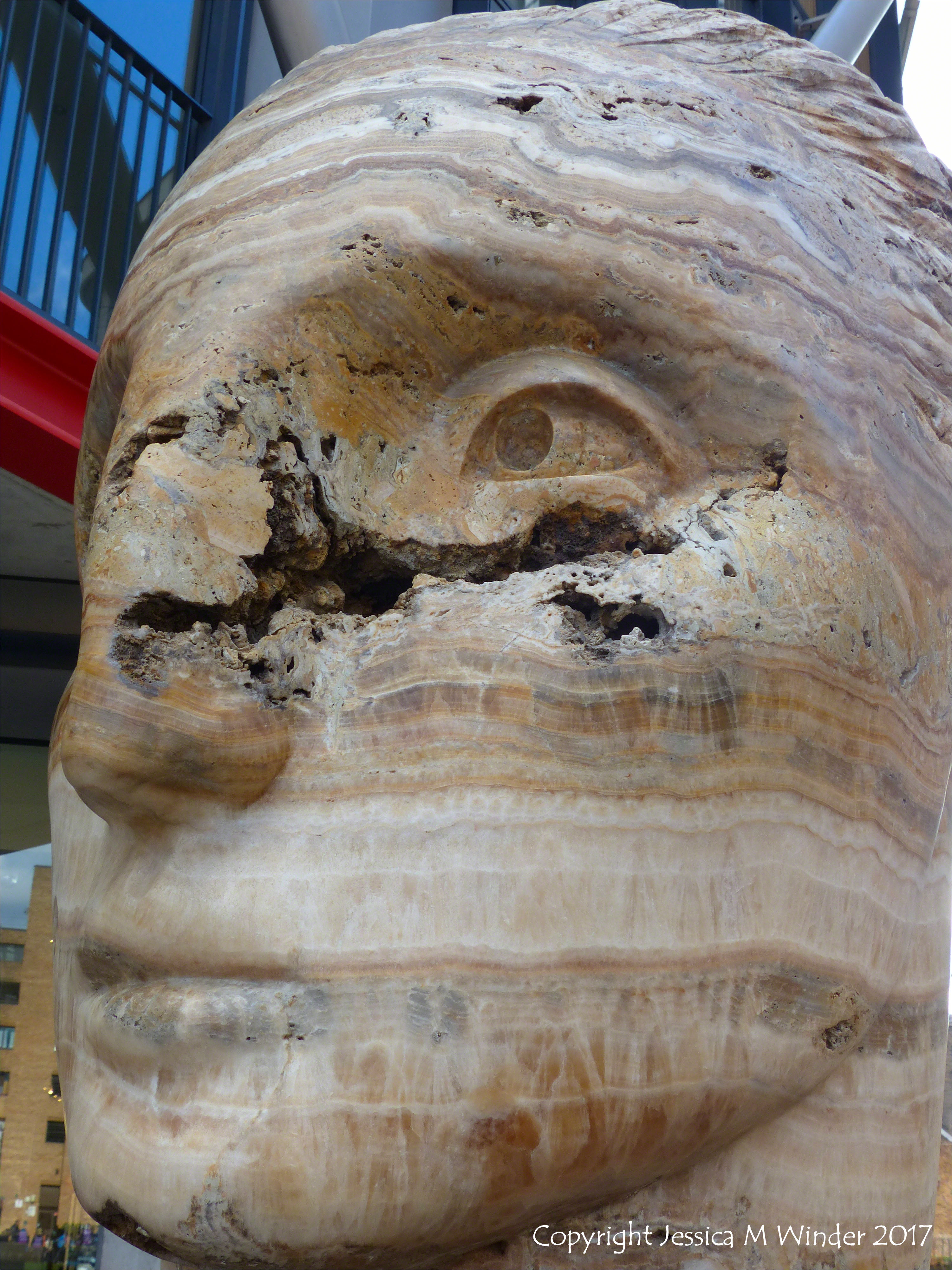 Clastic Igneous Rock 1 Tempesta C – Carved head called Tempesta made from clastic igneous rock by Emily Young and exhibited at Neo Bankside in London behind the Tate Modern Gallery, courtesy of Bowman Sculpture.