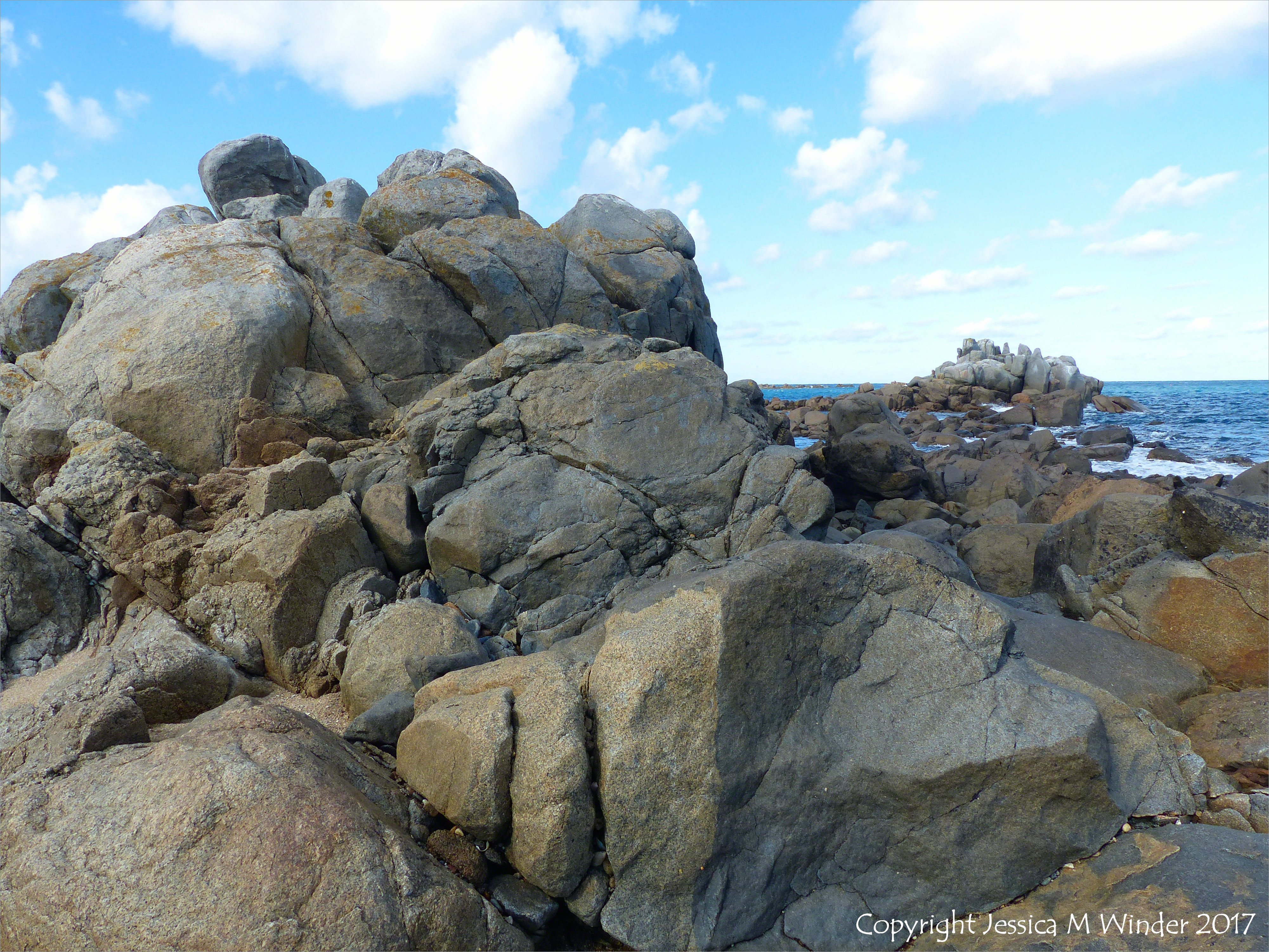 Rousse Point Rock Picture 12 – Rocky outcrop on the beach at Rousse Point showing drill holes from quarrying activities in the past.