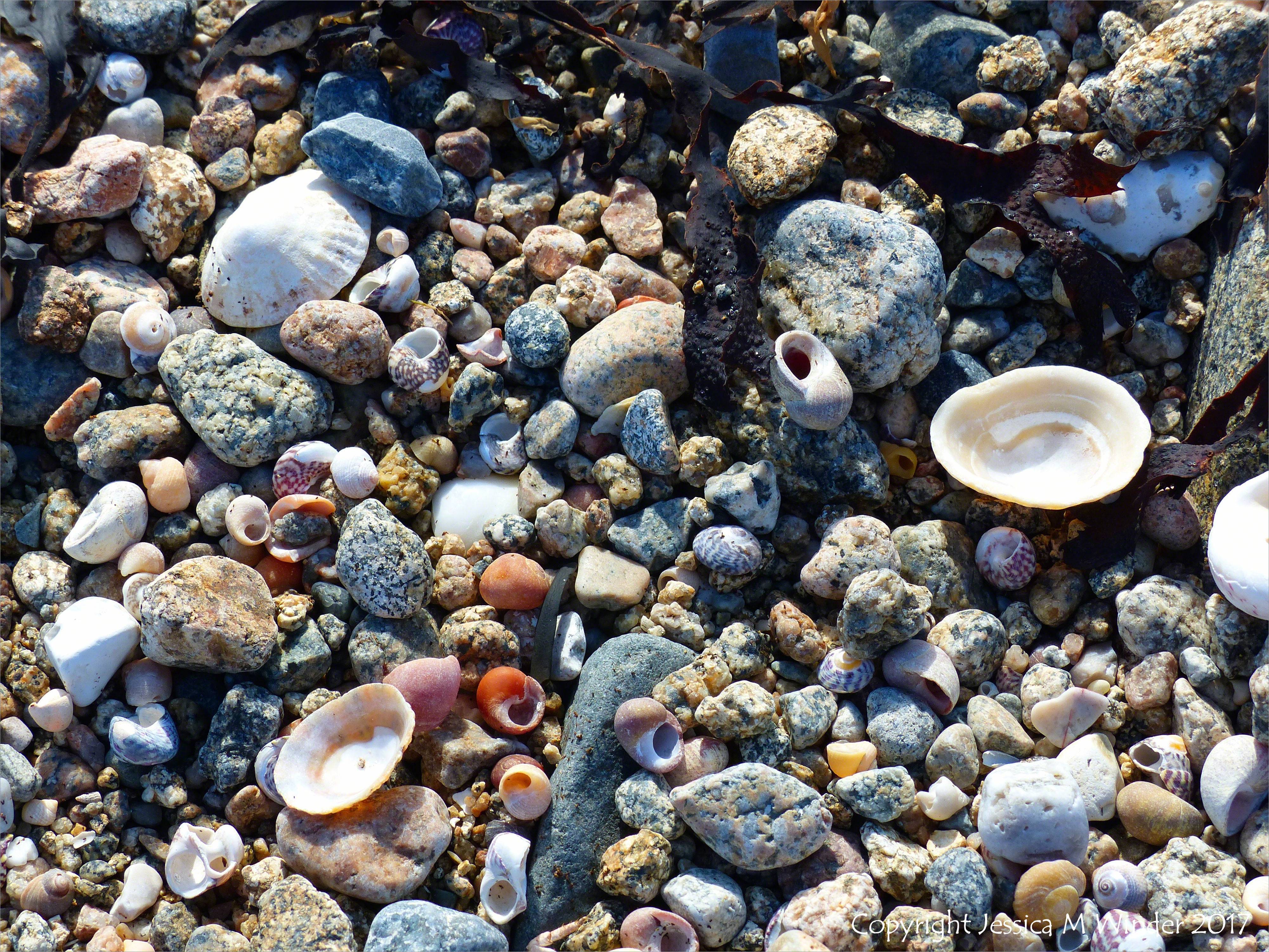 Rousse Point Seashell Picture 26 – Seashells and granite granules on the beach at Rousse Point on the Channel Island of Guernsey.