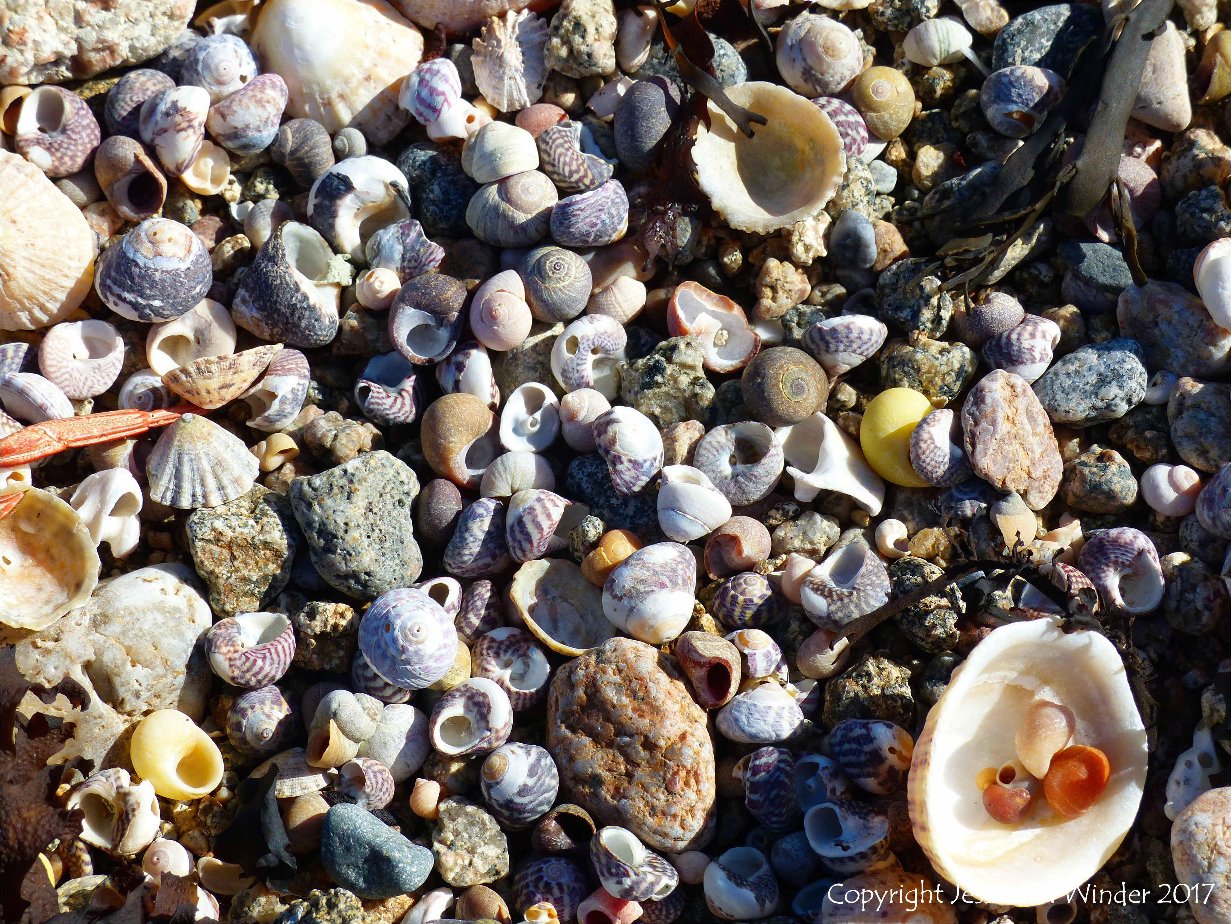 Rousse Point Seashell Picture 28 – Seashells and granite granules on the beach at Rousse Point on the Channel Island of Guernsey.