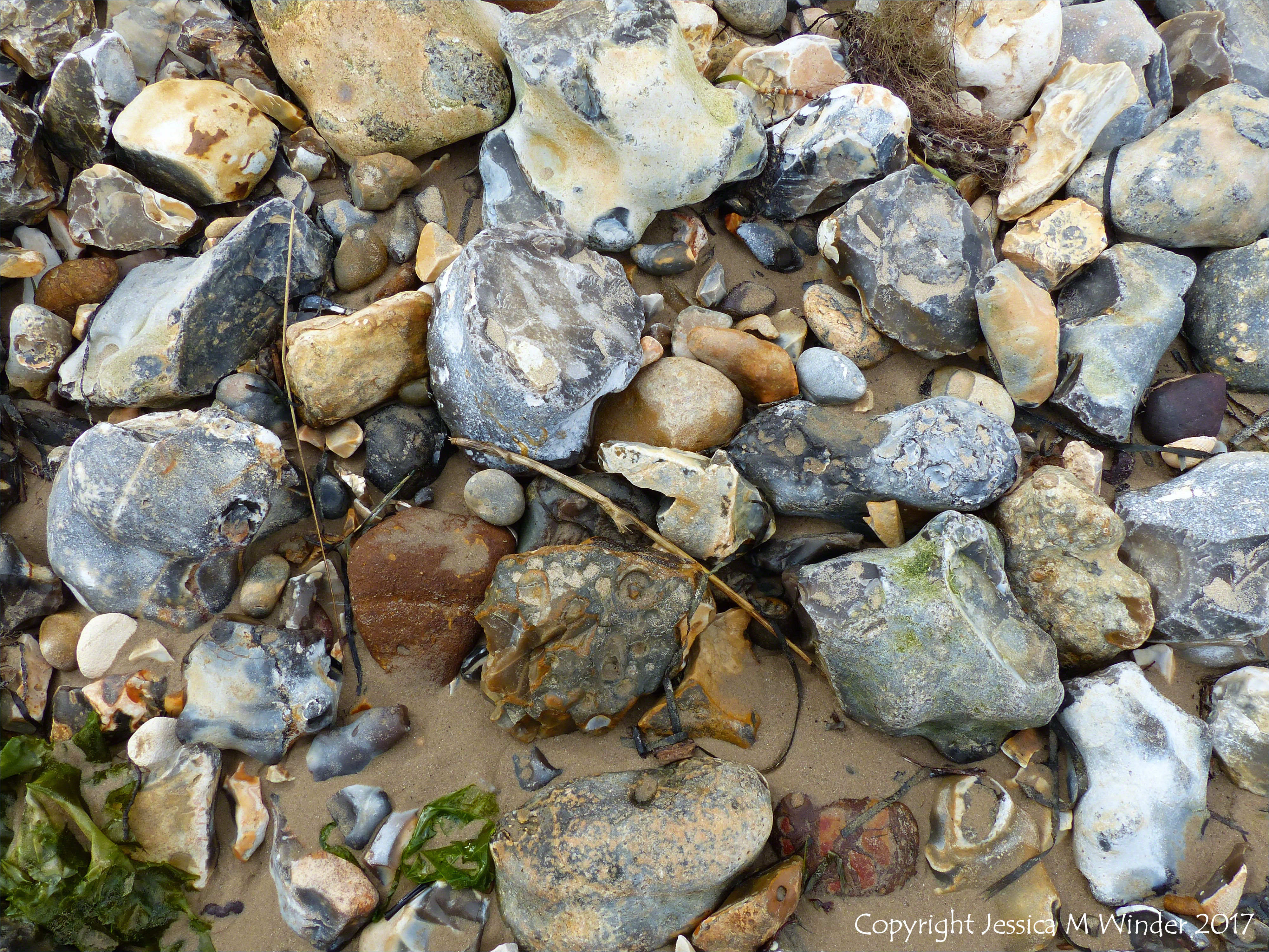 Flints & Ironstones Studland South 7 – Beach stones and pebbles including flints and ironstones derived from the chalk cliffs at South Beach, Studland, Dorset, England.