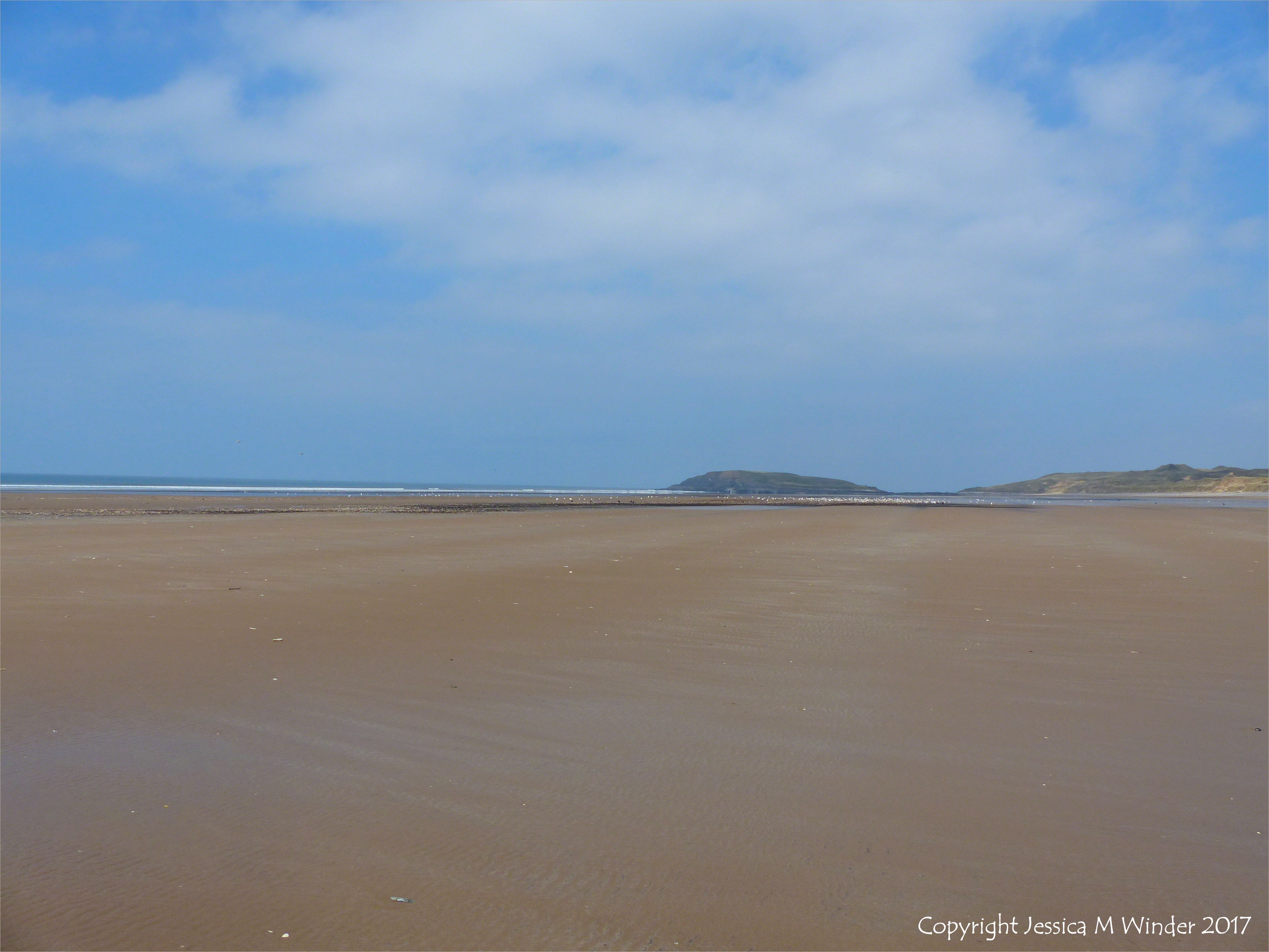 Hill End to Spaniard Rocks 43 – Looking north on Rhossili beach towards Burry Holms with an interesting dark line on the sand just visible in the distance.
