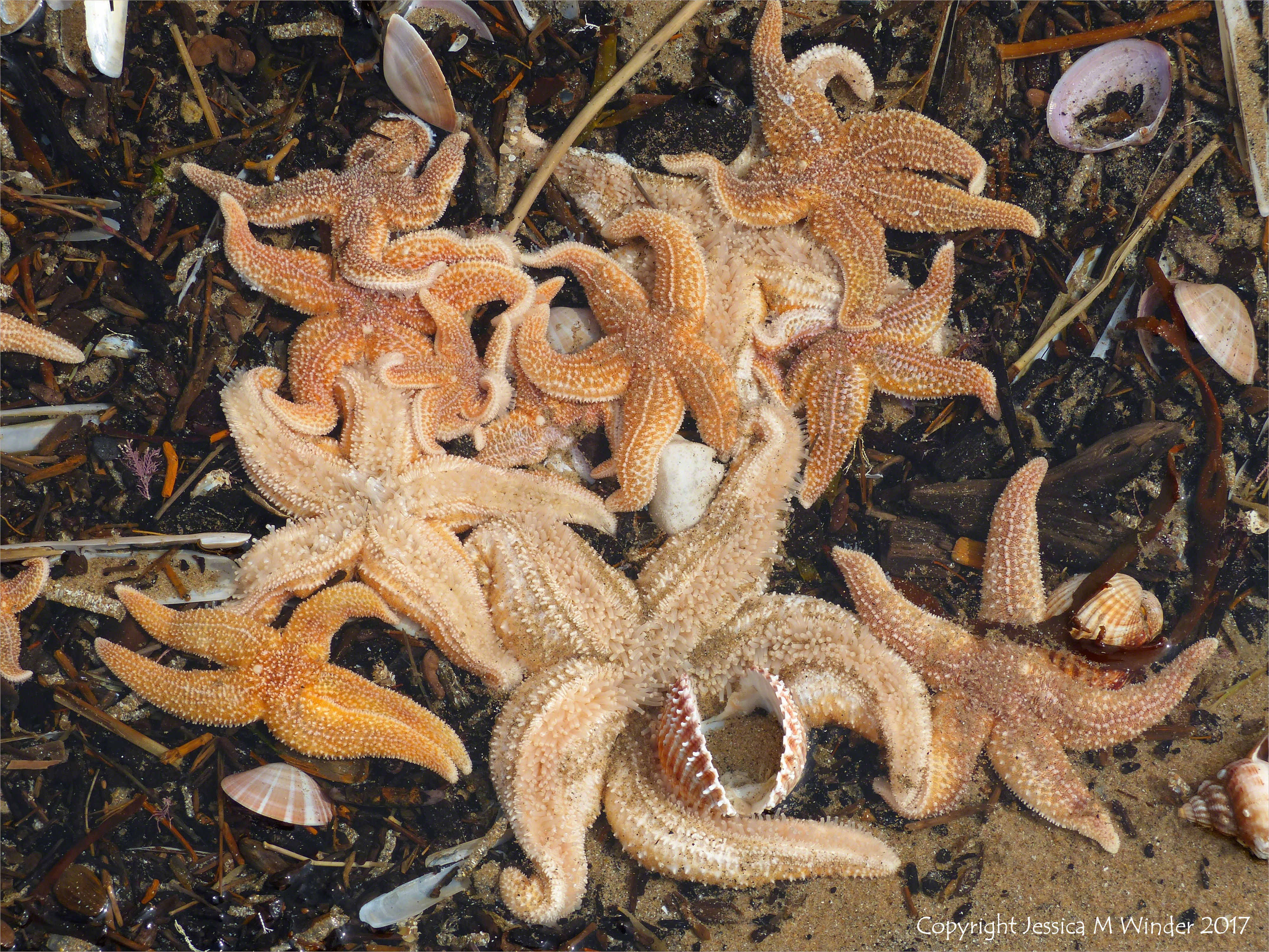 Hill End to Spaniard Rocks 59 – Dead common starfishes (Asterias rubens) washed up on the strandline at Rhossili in Gower, 7th April 2017.