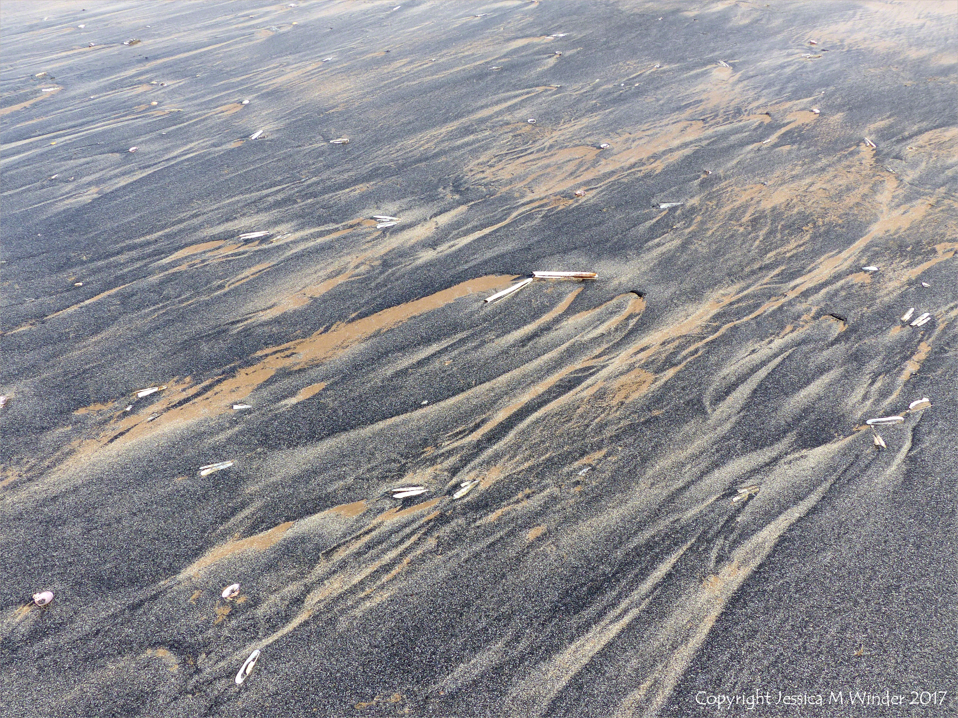 Hill End To Spaniard Rocks 102 – Natural patterns in black detritus on the strandline at Rhossili beach, Gower, South Wales, 7th April 2017.
