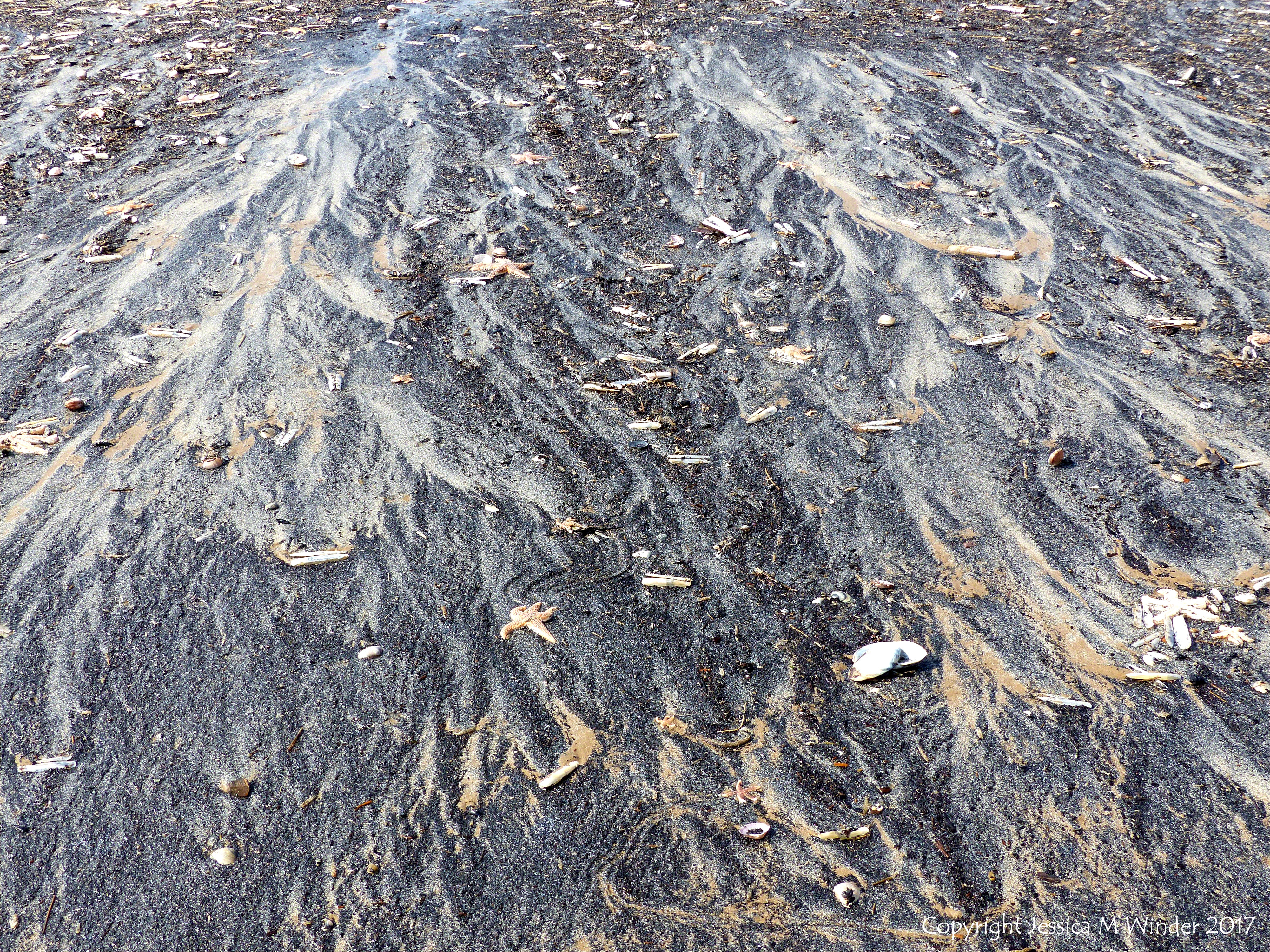 Hill End To Spaniard Rocks 101 – Natural patterns in black detritus on the strandline at Rhossili beach, Gower, South Wales, 7th April 2017.