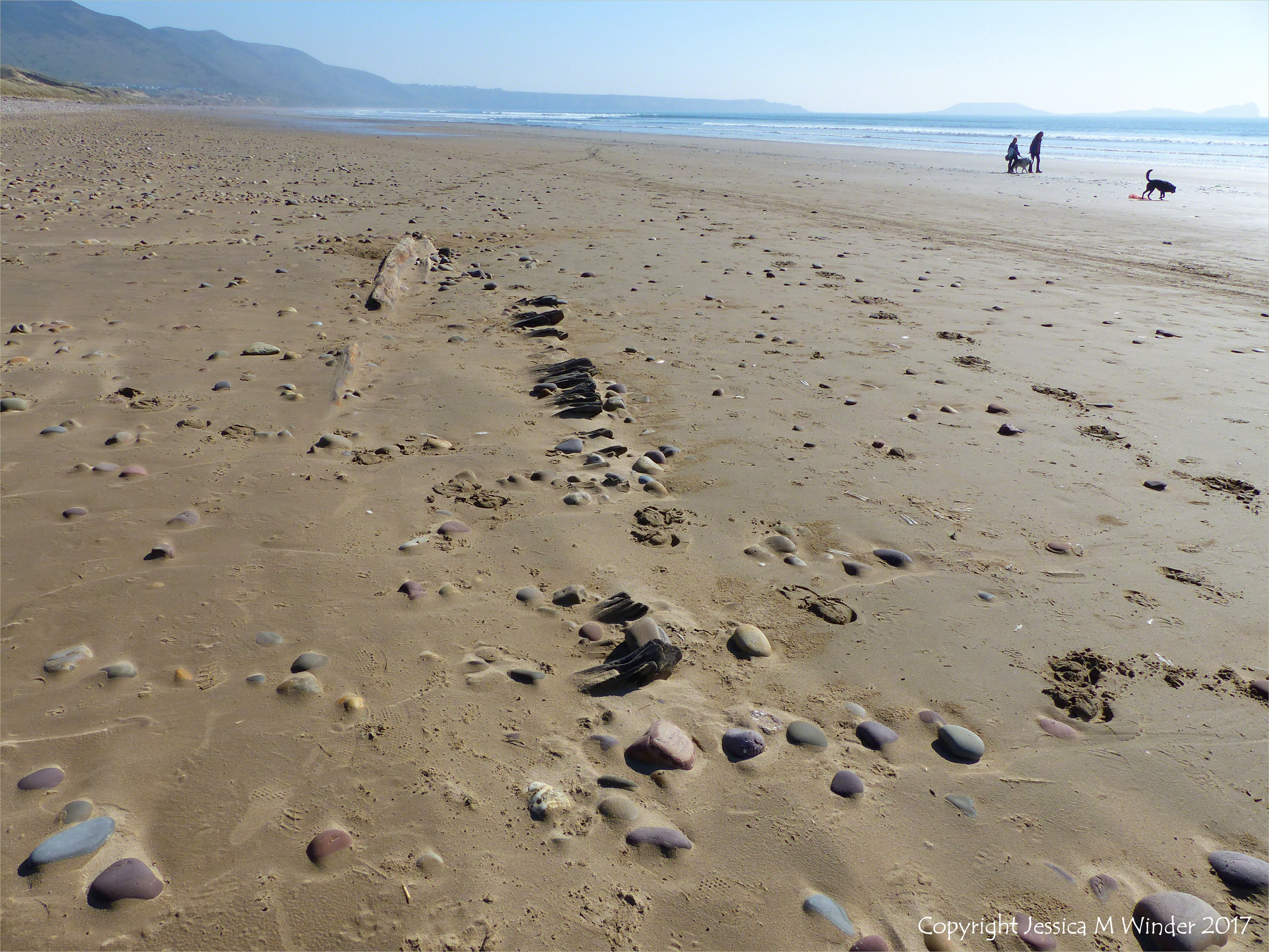 Hill End To Spaniard Rocks 143 – Wooden ribs and keel showing the outline of the ship Anne just visible in the sand and pebbles at Rhossili, Gower peninsula, South Wales, 7th April 2017.