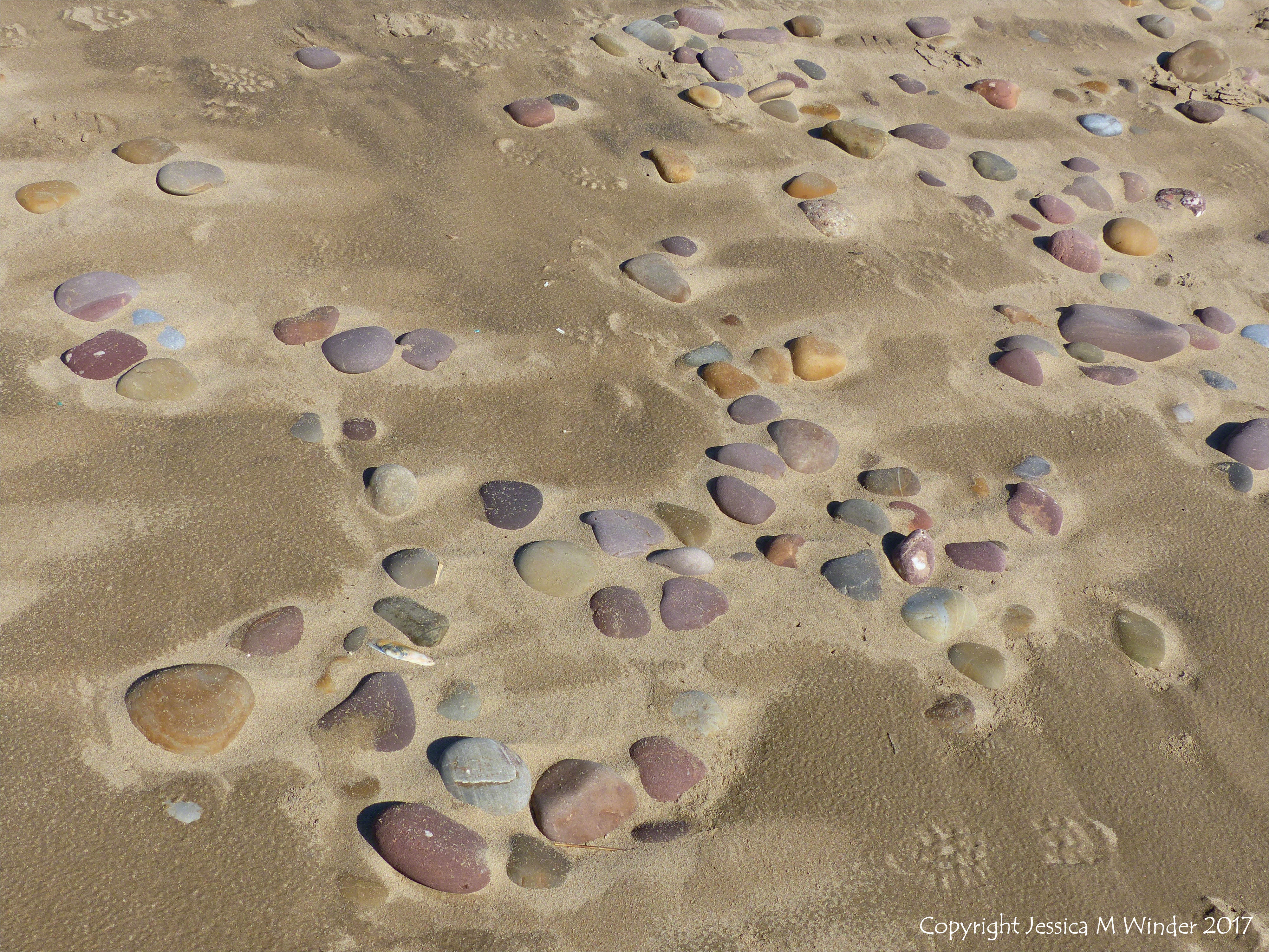 Hill End To Spaniard Rocks 144 – Coloured beach stones in damp sand between high and low tide levels at Rhossili, Gower, 7th April 2017.