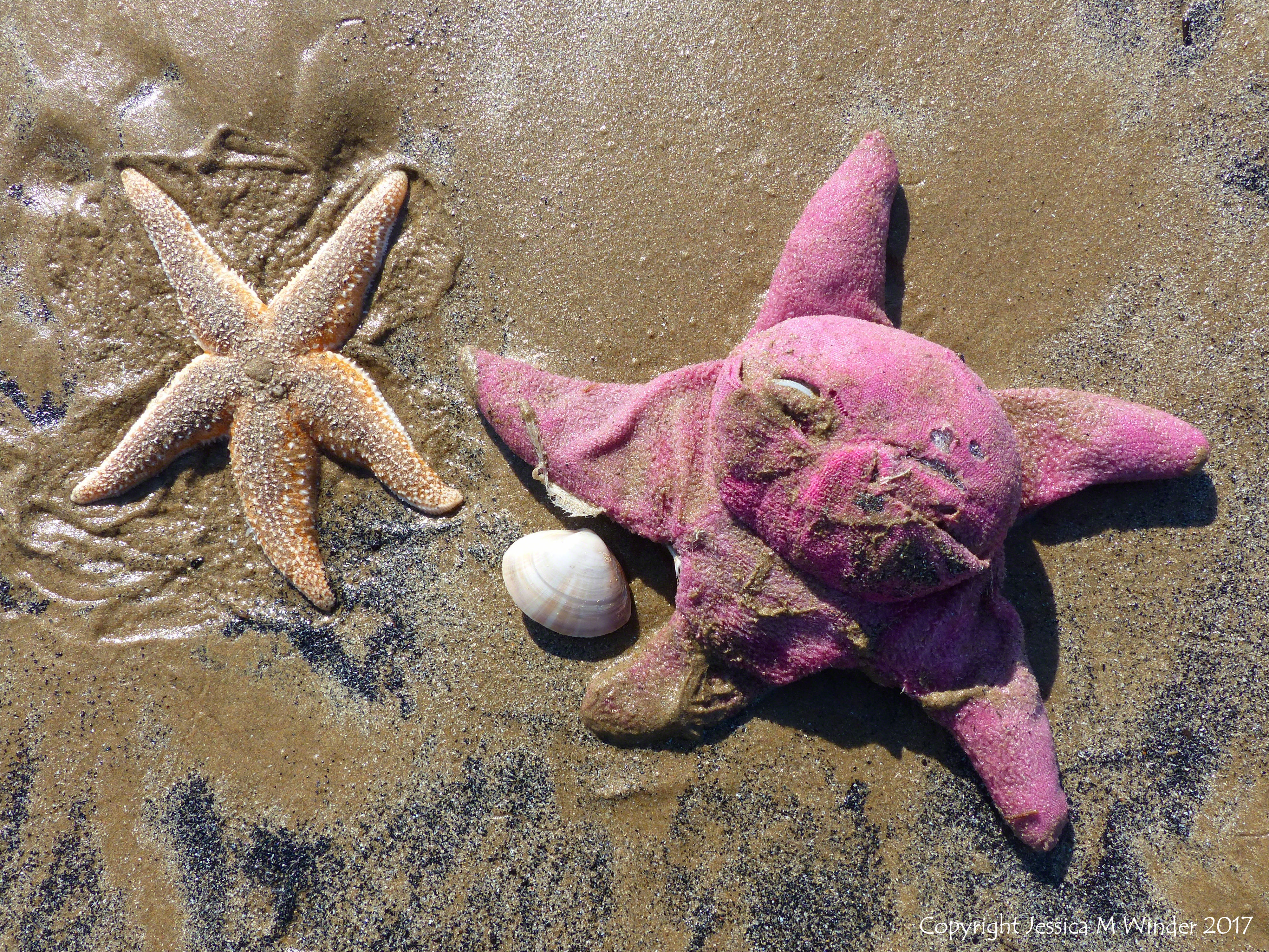Hill End To Spaniard Rocks 149 – Soggy pink soft toy starfish next to a real starfish (Asterias rubens) stranded on the beach at Rhossili, Gower, photographed exactly as found on 7th April 2017.