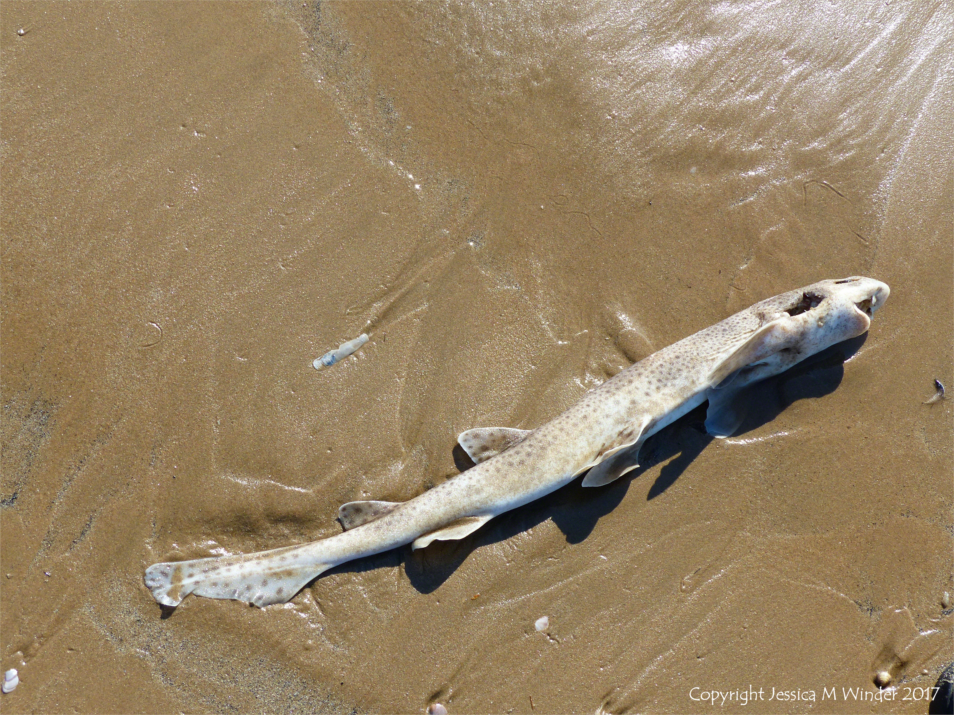 Hill End To Spaniard Rocks 157 – Dead dogfish washed up on the sandy beach at Rhossili on the Gower Peninsula, South Wales, 7th April 2017.