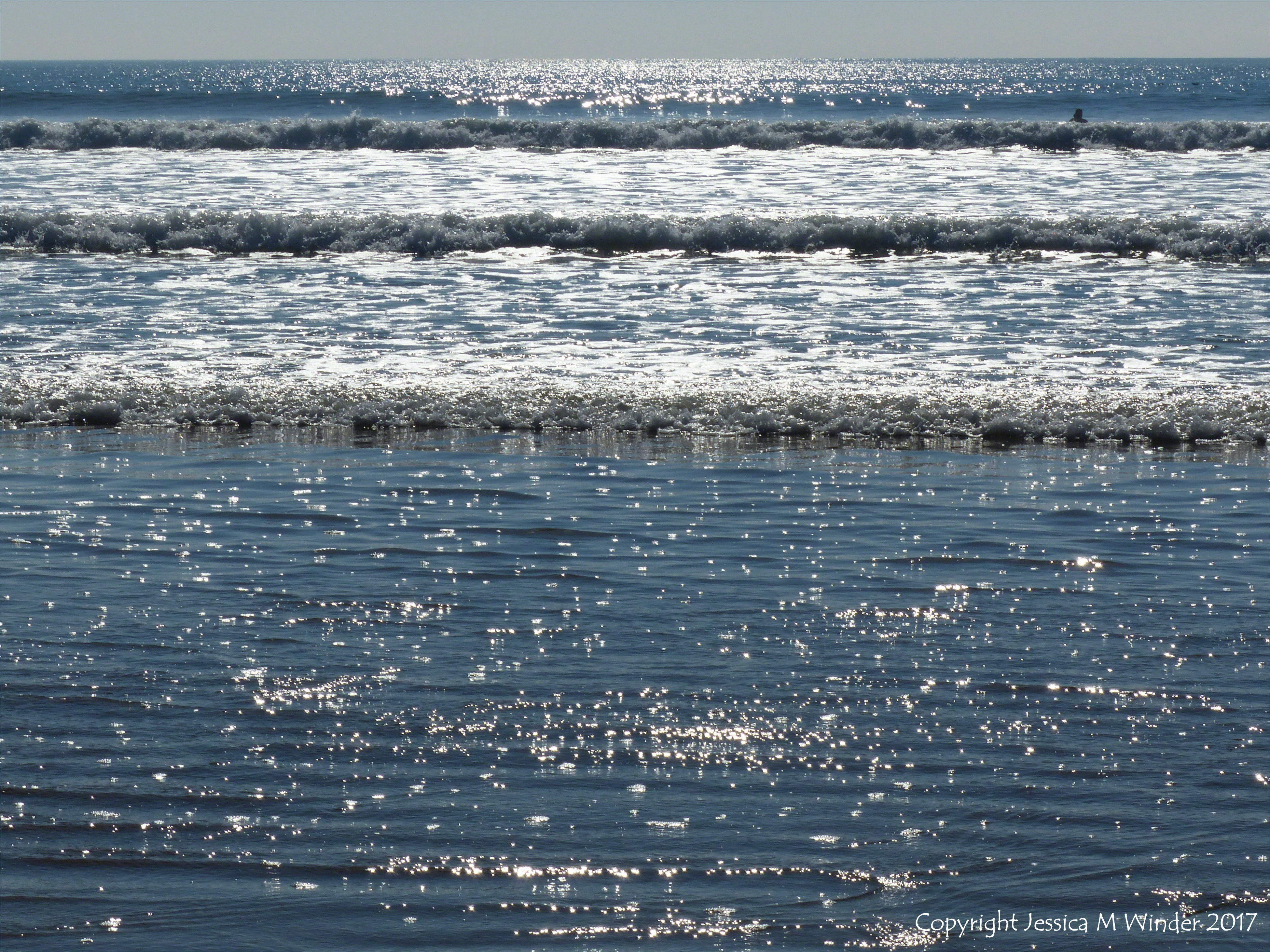 Hill End To Spaniard Rocks 165 – Waves and surf on the incoming tide sparkling in the sunshine at Rhossili Beach on the Gower peninsula, South Wales, 7th April 2017.