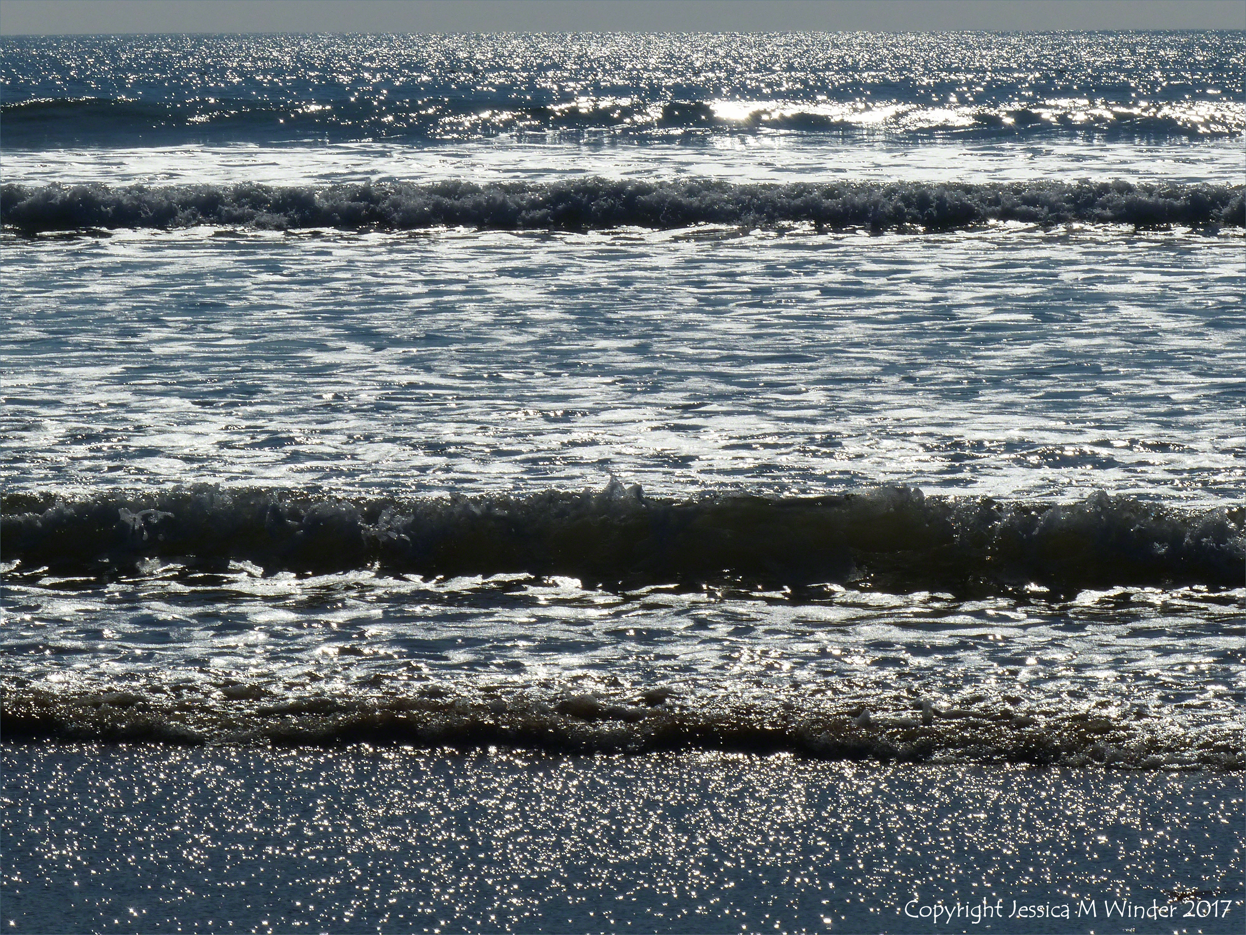 Hill End To Spaniard Rocks 166 – Waves and surf on the incoming tide sparkling in the sunshine at Rhossili Beach on the Gower peninsula, South Wales, 7th April 2017.