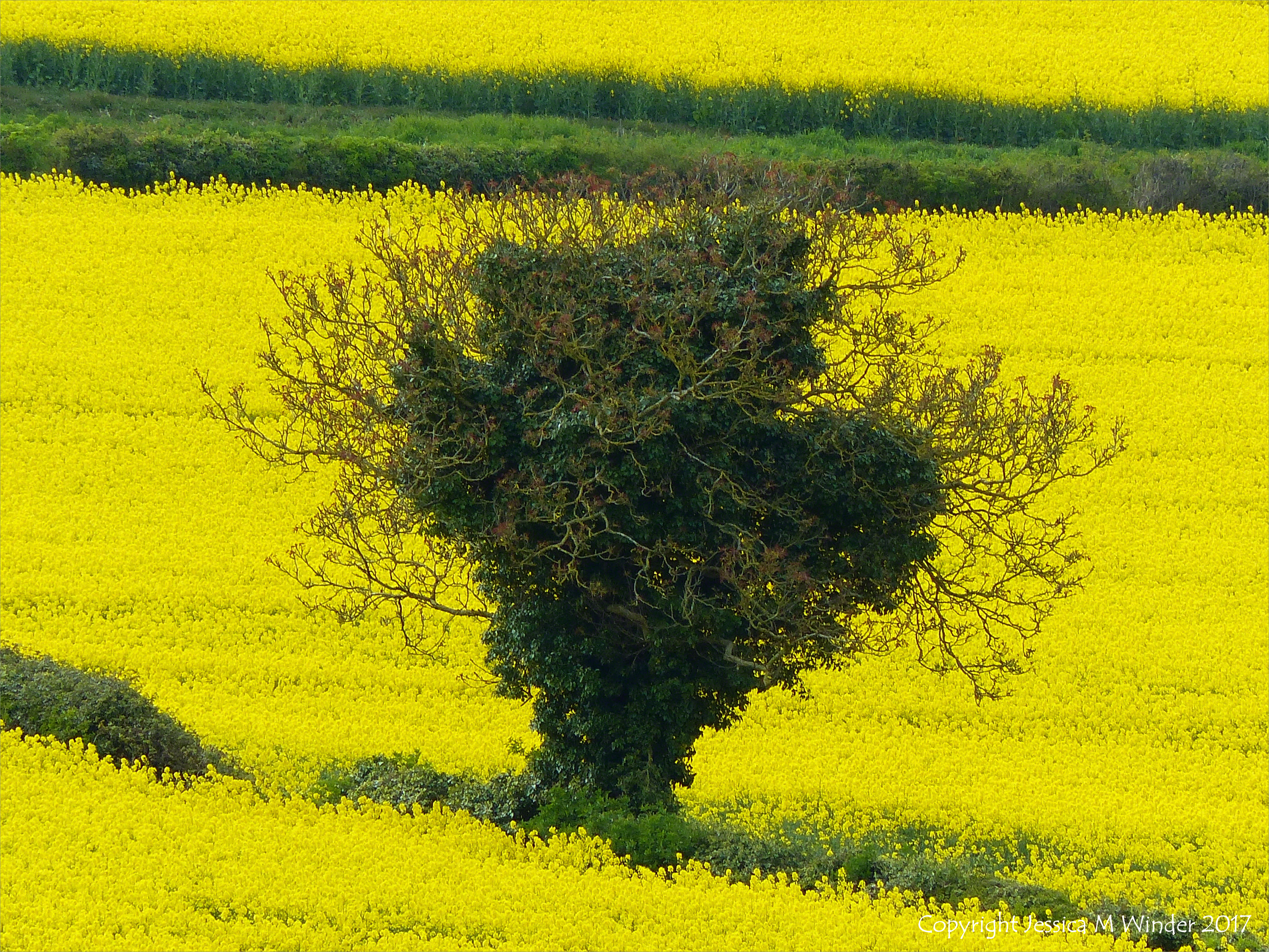 Spring Fields at Charlton Down 9 – Field boundary hedgerows and tree with flowering oilseed rape crop on a hillside in the English landscape around the Dorset village of Charlton Down, 17th April 2017.