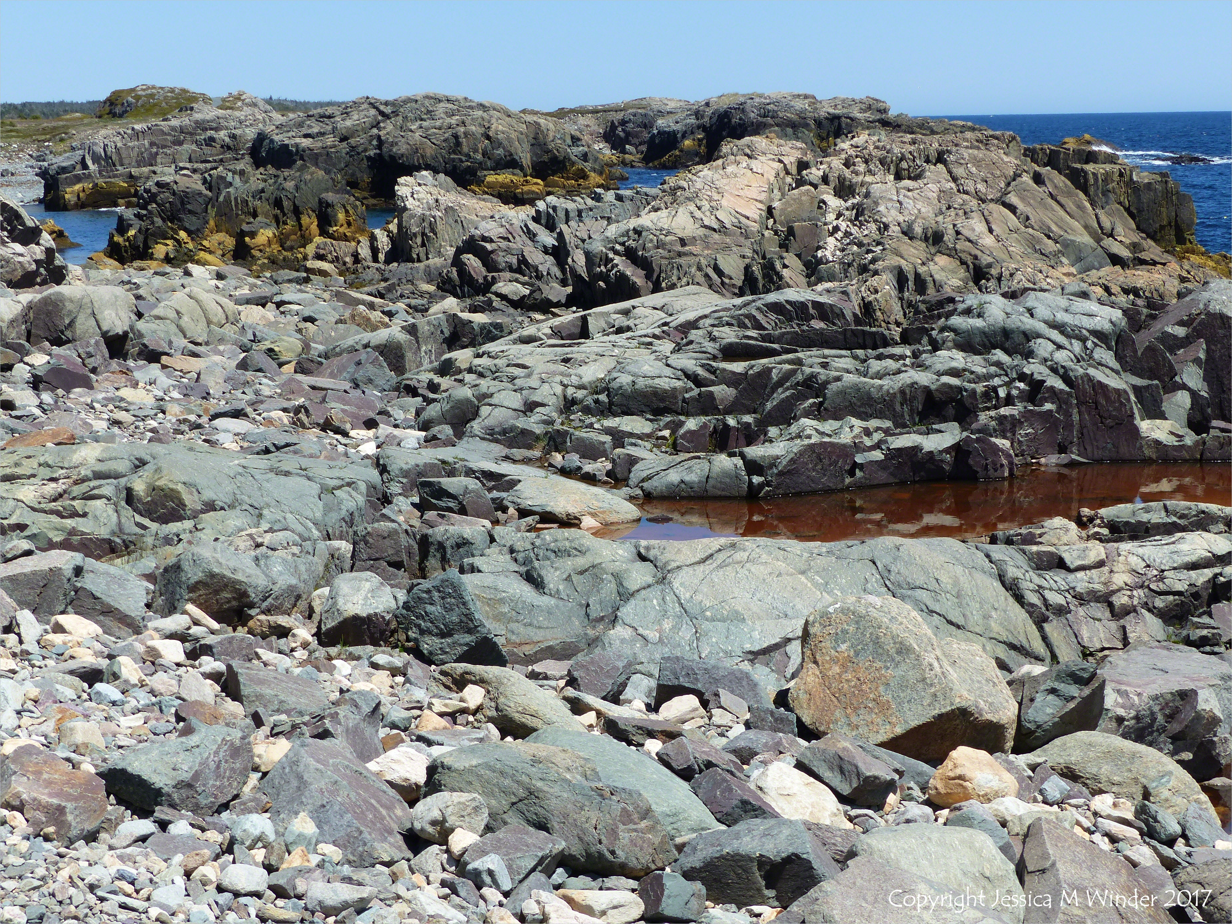 Pyroclastic Breccia Patterns 3 – The shoreline with rocks of pyroclastic breccia north of Louisbourg Lighthouse in Cape Breton, Nova Scotia, Canada, with angular fragments of rock in a matrix of volcanic ash.