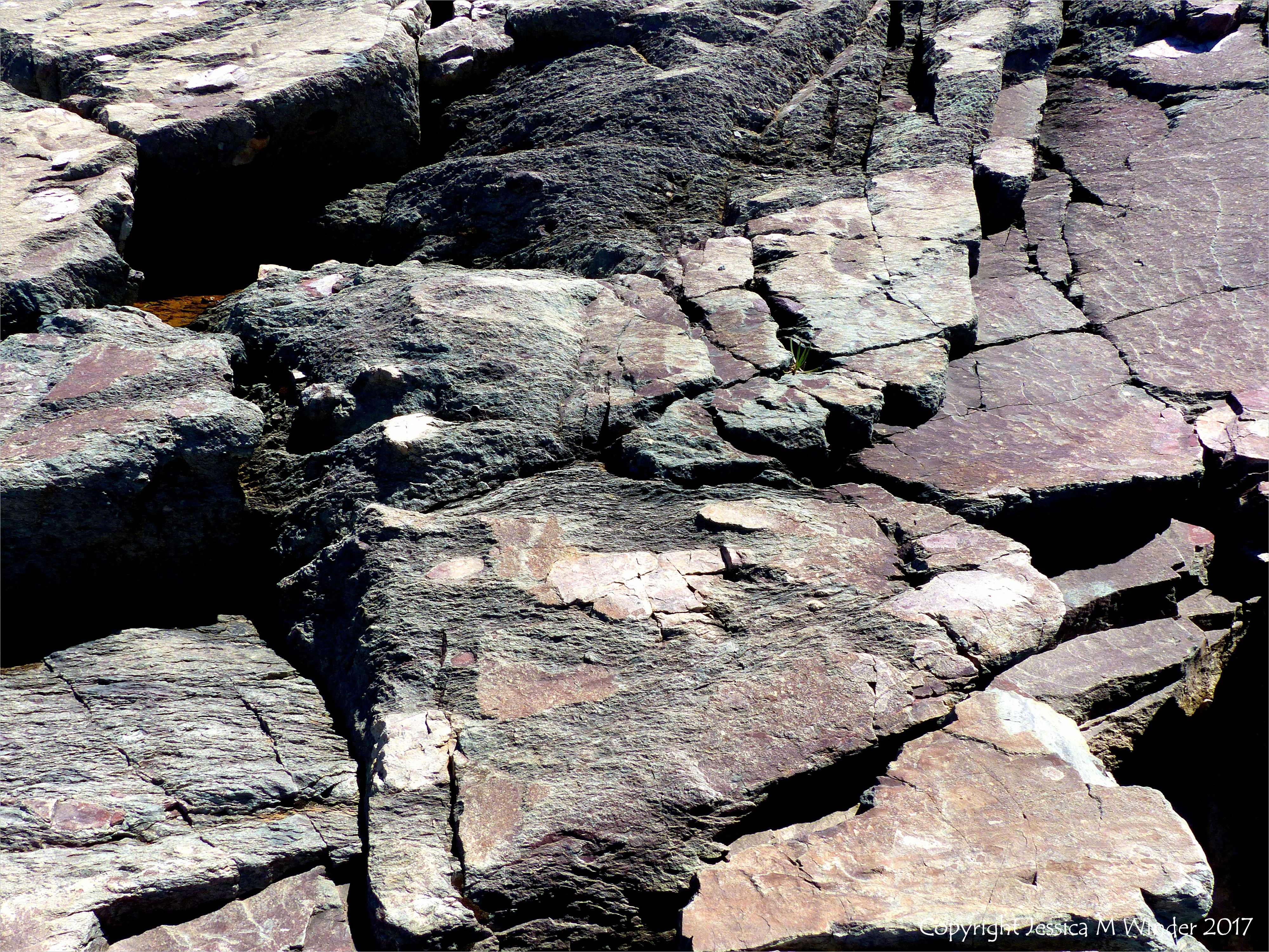 Pyroclastic Breccia Patterns 14 – Angular rock fragments embedded in a volcanic ash matrix from a pyroclastic flow in Cape Breton Island near Louisbourg Lighthouse, Nova Scotia, Canada.
