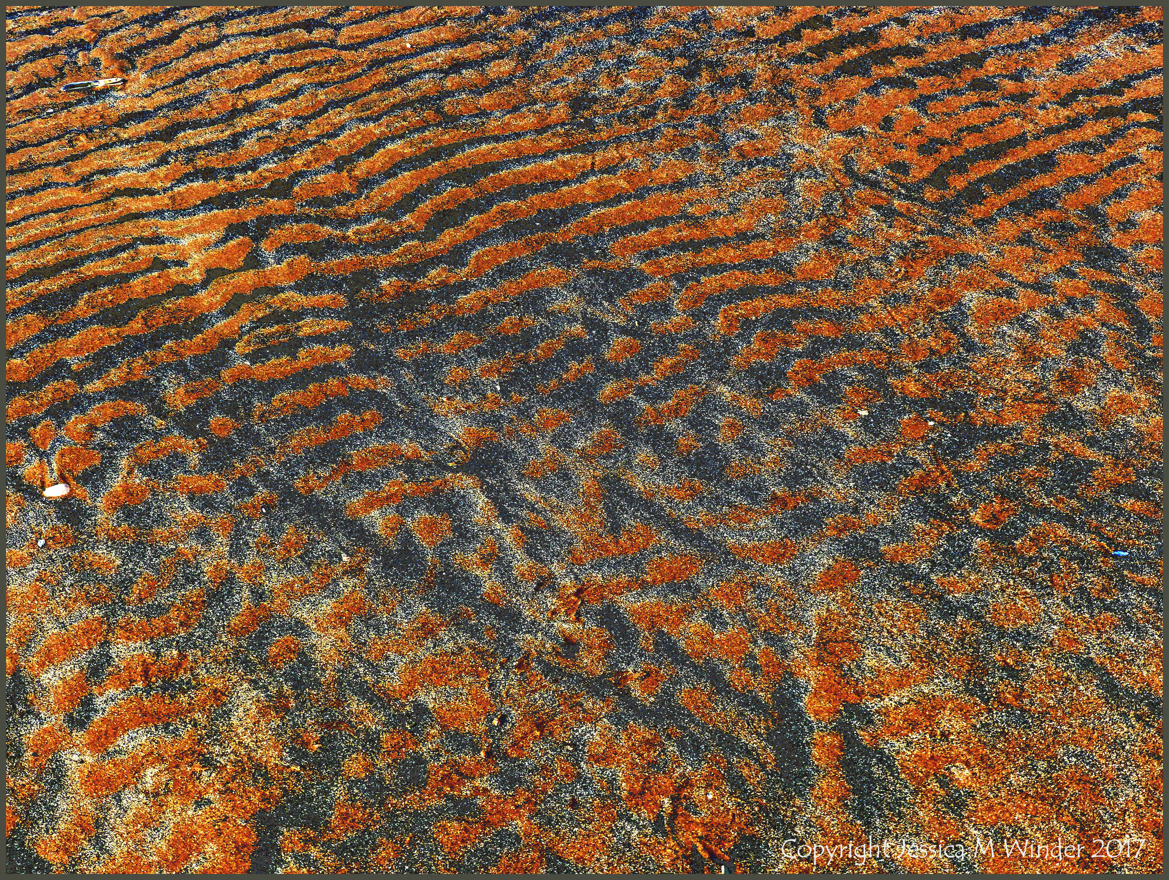 Patterned Sand 11 – Naturally formed patterns of black sediment on yellow sand were photographed on the beach at Rhossili Bay, Gower, in April 2017. The black sediments were mainly composed of minute pieces of rotten wood, coal dust, and miniscule fish bones, with a small proportion of seeds. The images have been digitally colour-enhanced to emphasise the patterns of this wonderful natural abstract art.