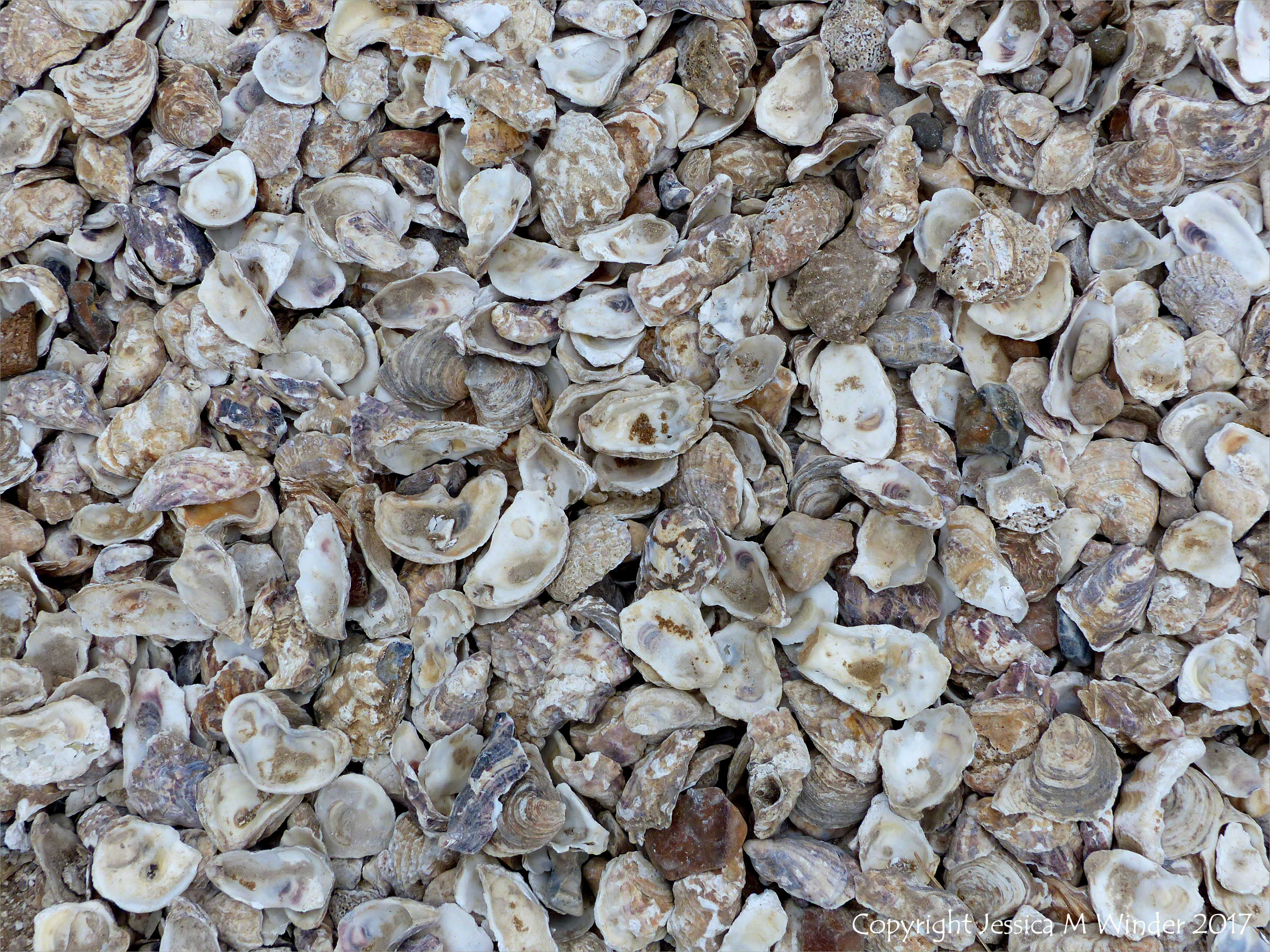 Modern Oyster Midden 11 – Oyster shells in a heap at Whitstable on the north Kent coast in England, for use as cultch on the sea bed for collecting young oyster spat