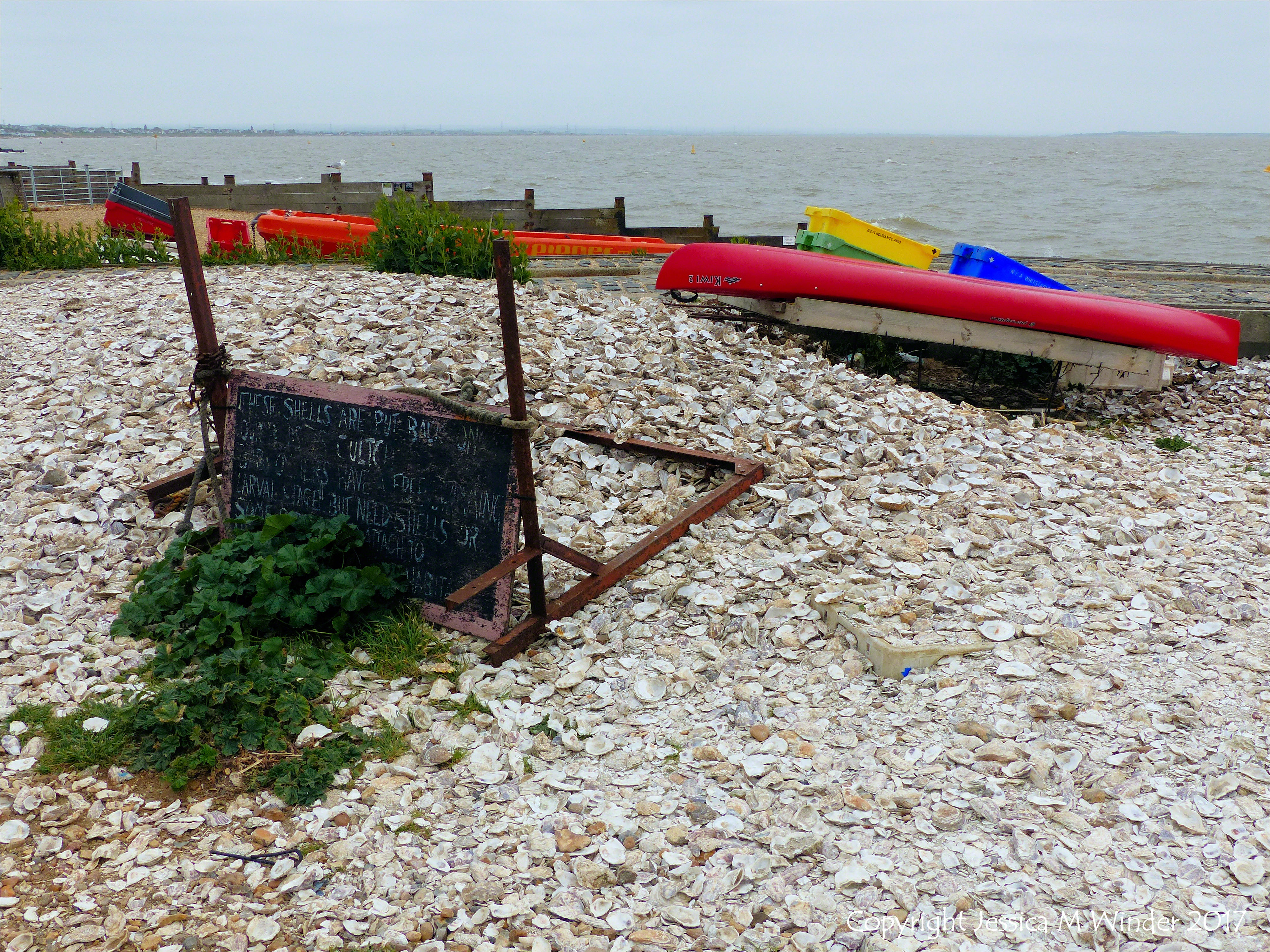 Modern Oyster Midden 6 – Oyster shells in a heap on the beach (with a boat and plastic crates) at Whitstable on the north Kent coast in England, for use as cultch on the sea bed for collecting young oyster spat.