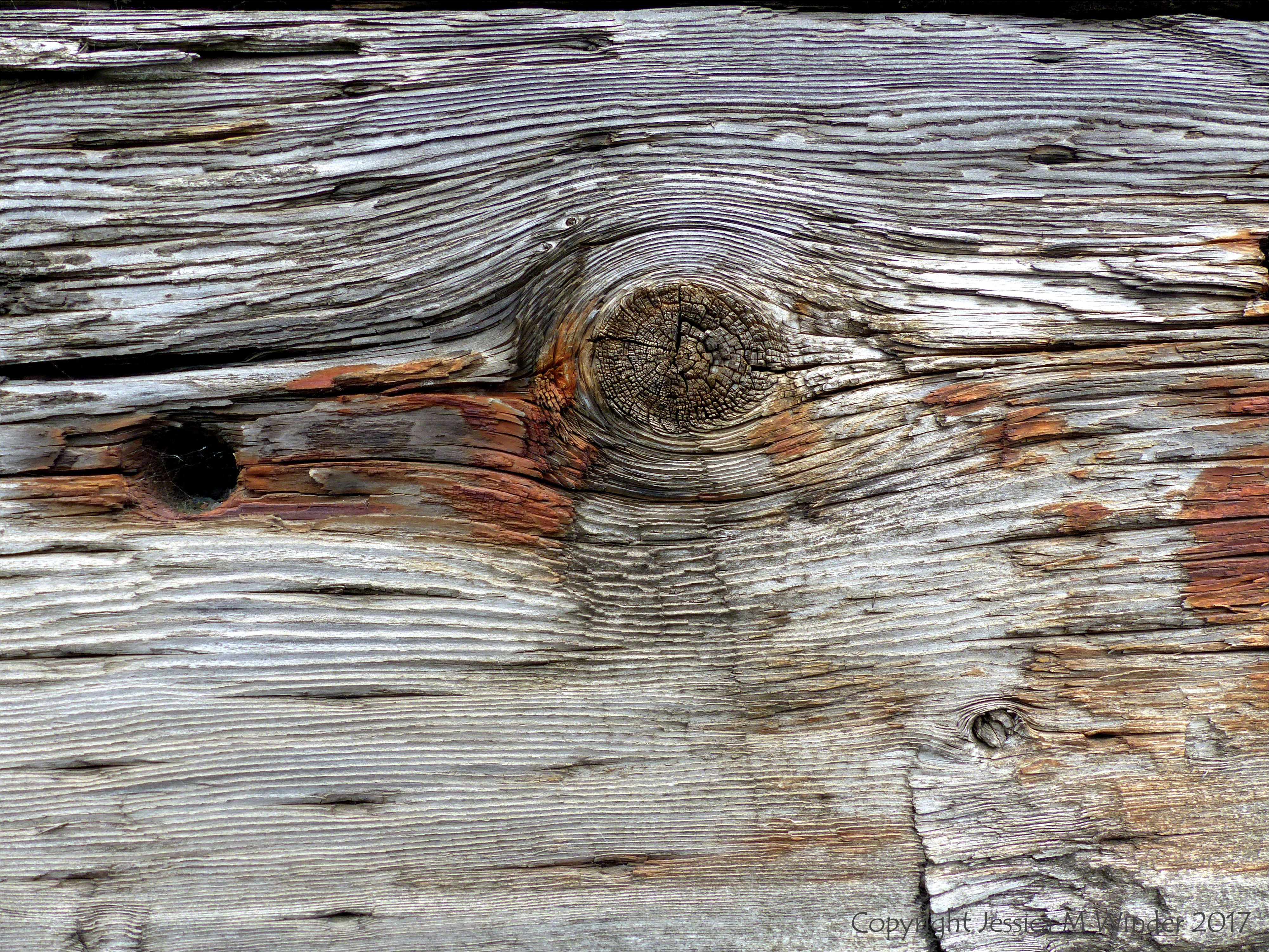 Whitstable Woodgrain 7 – Rust-stained woodgrain in old timber railway sleepers recycled as fencing on the harbour at Whitstable, Kent, England.