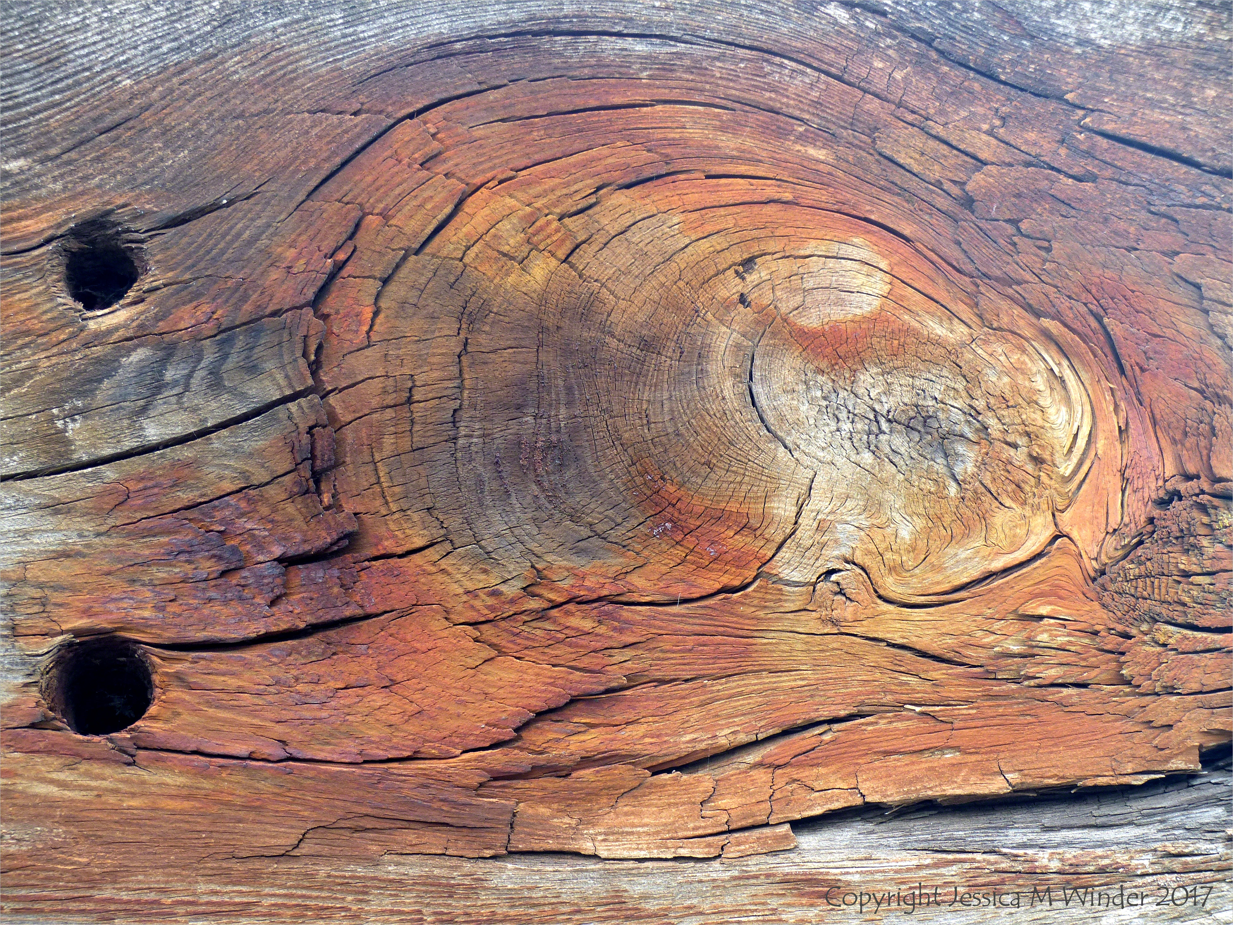 Whitstable Woodgrain 5 – Rust-stained woodgrain in old timber railway sleepers recycled as fencing on the harbour at Whitstable, Kent, England.