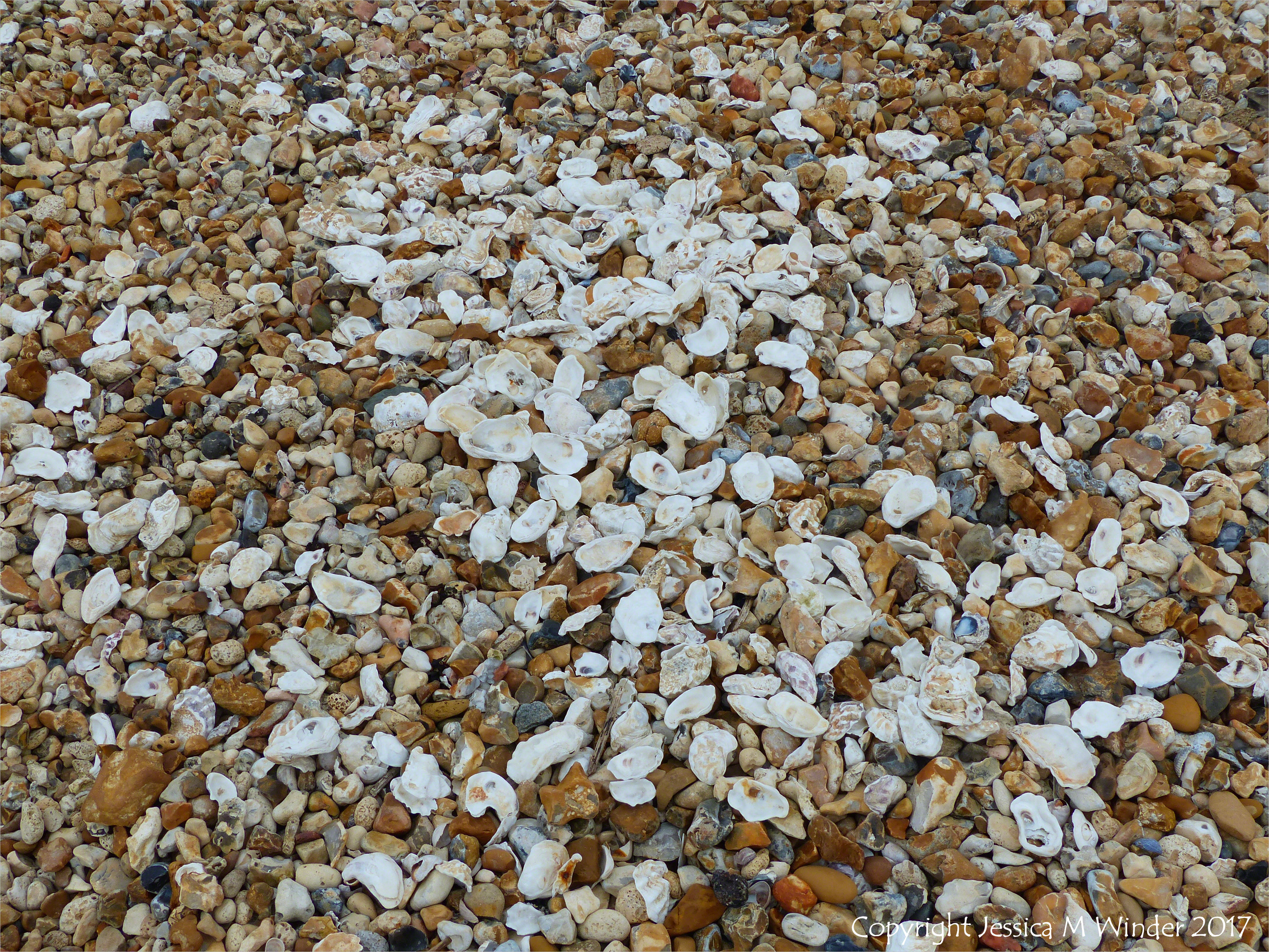 Whitstable Seashore Shells & Shingle 18 – Oyster shells on the shingle strandline of the beach at Whitstable in Kent, England.