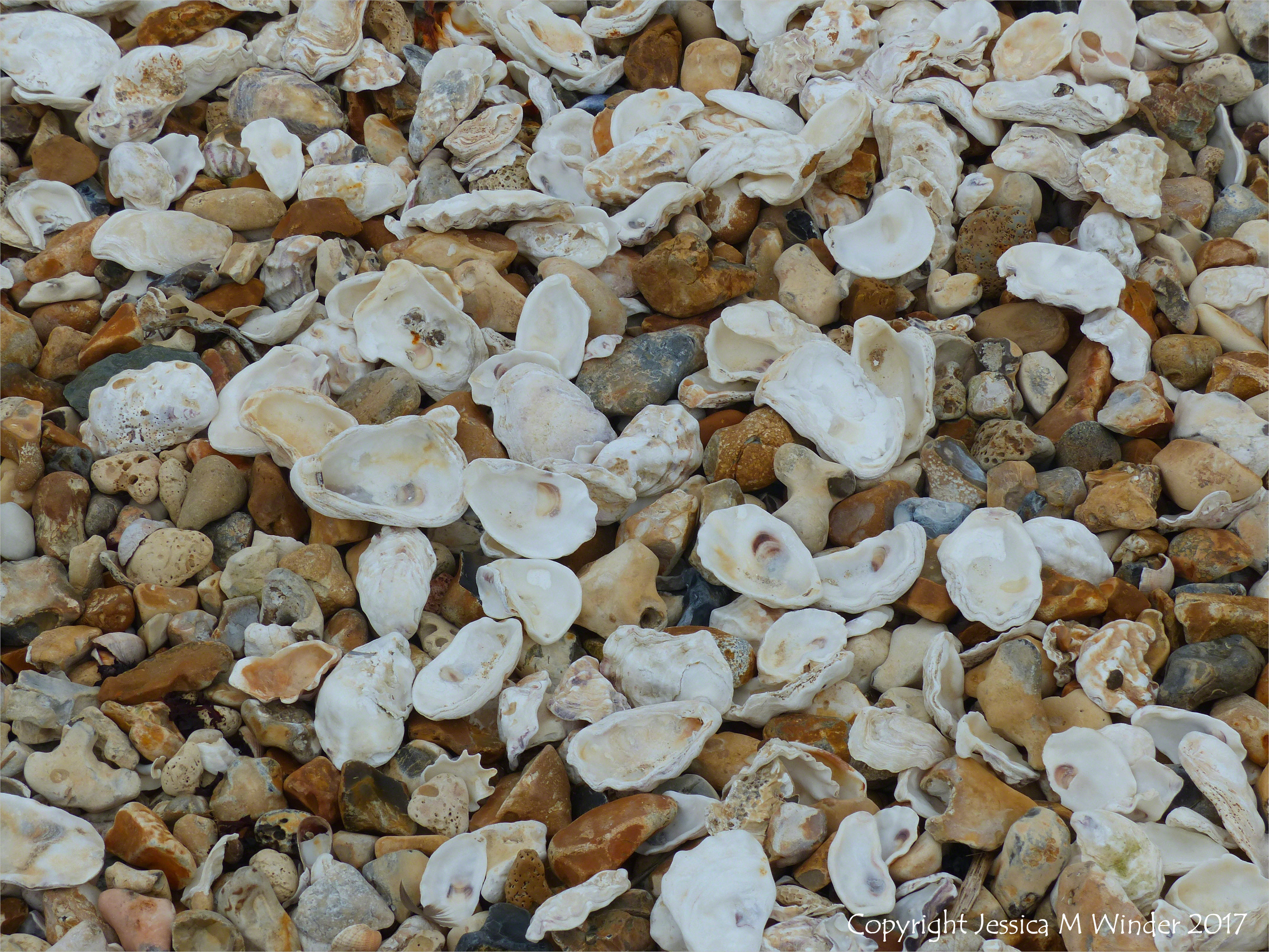 Whitstable Seashore Shells & Shingle 19 – Oyster shells on the shingle strandline of the beach at Whitstable in Kent, England.